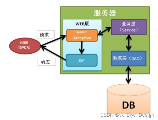 页面发送请求给控制器,控制器调用业务层处理逻辑,逻辑层向持久层发送请求,持久层与数据库交互,后将结果返回给业务层,业务层将处理逻辑发送给控制器,控制器再调用视图展现数据。