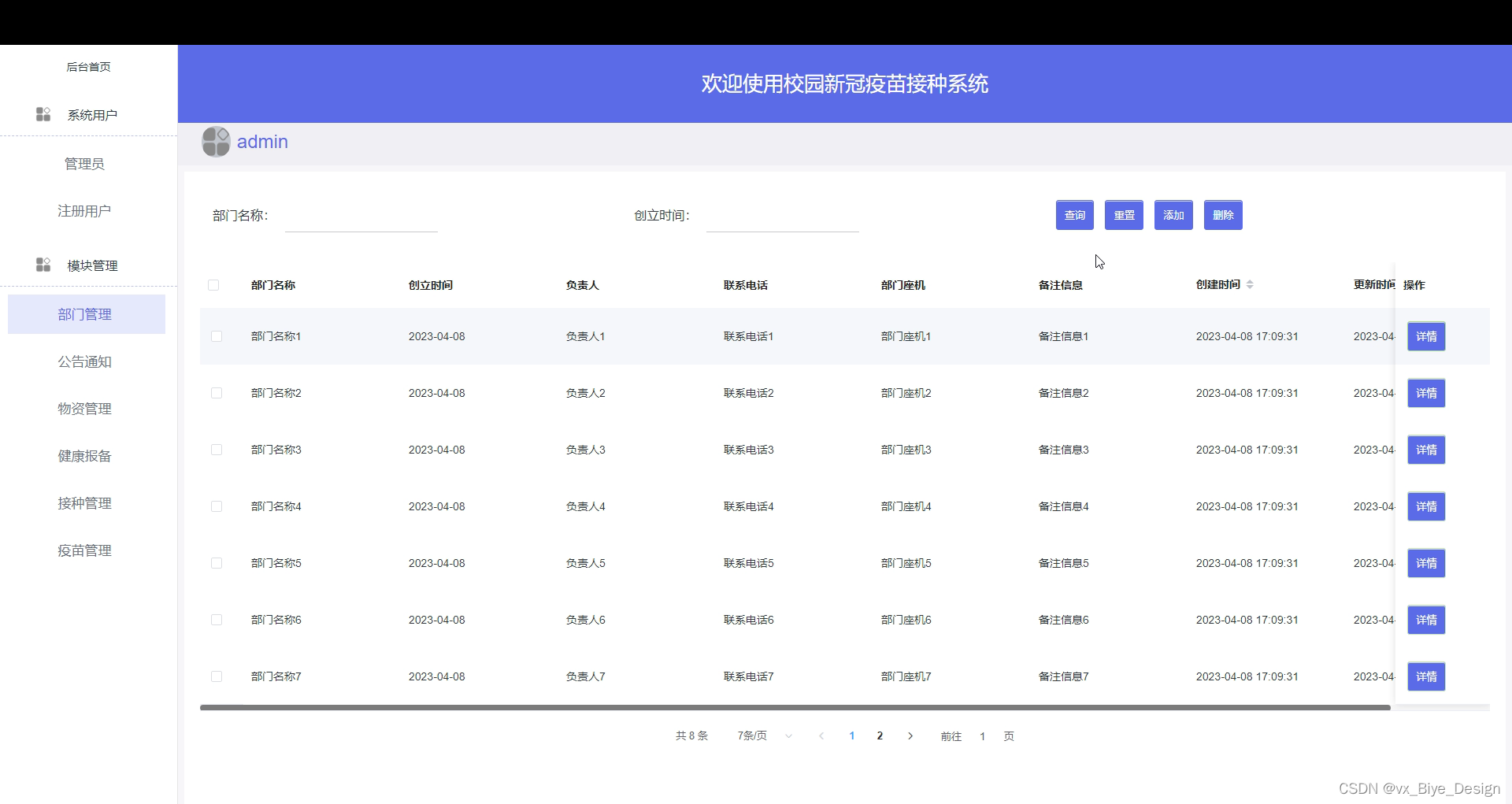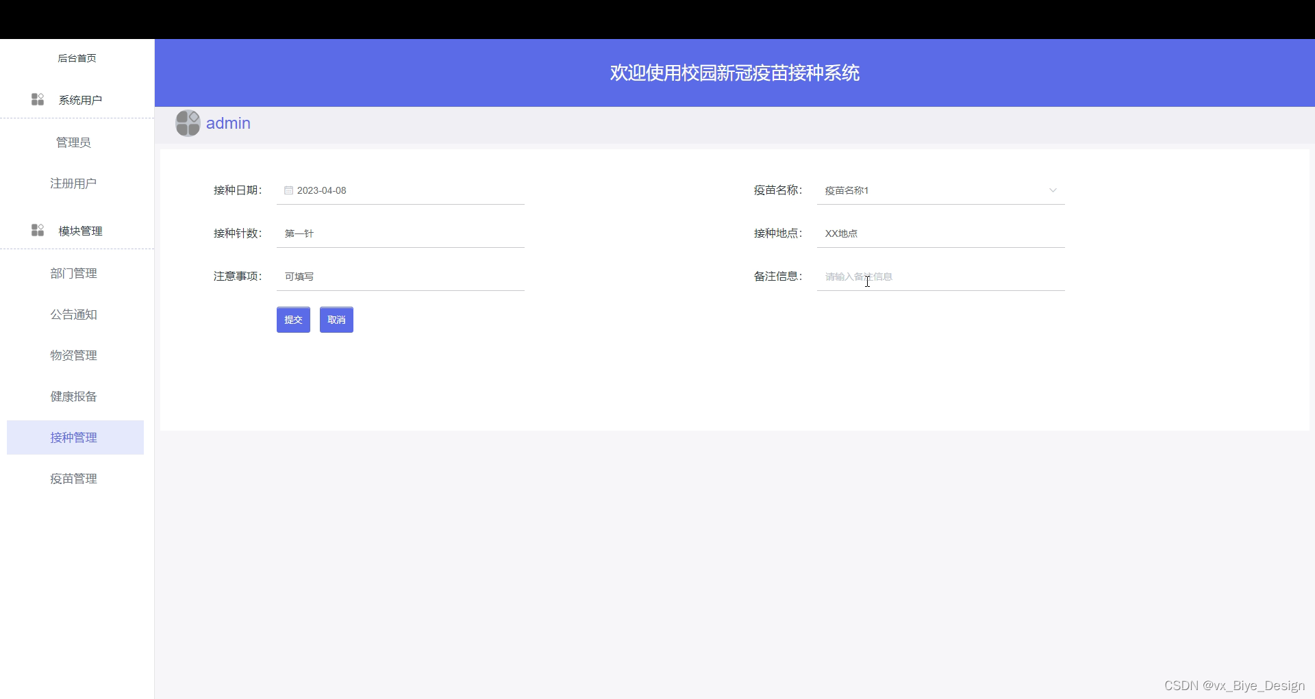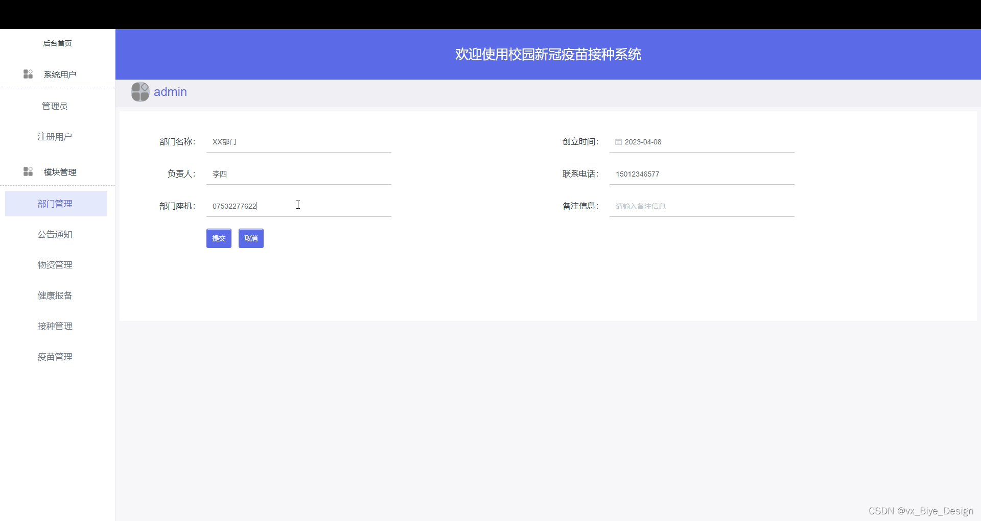 3、功能的完善性:后台首页,物资管理统计,疫苗管理统计,系统用户(管理员,注册用户),模块管理(部门管理,公共通知,物资管理,健康报备,接种管理,疫苗管理)等模块的修改维护操作。