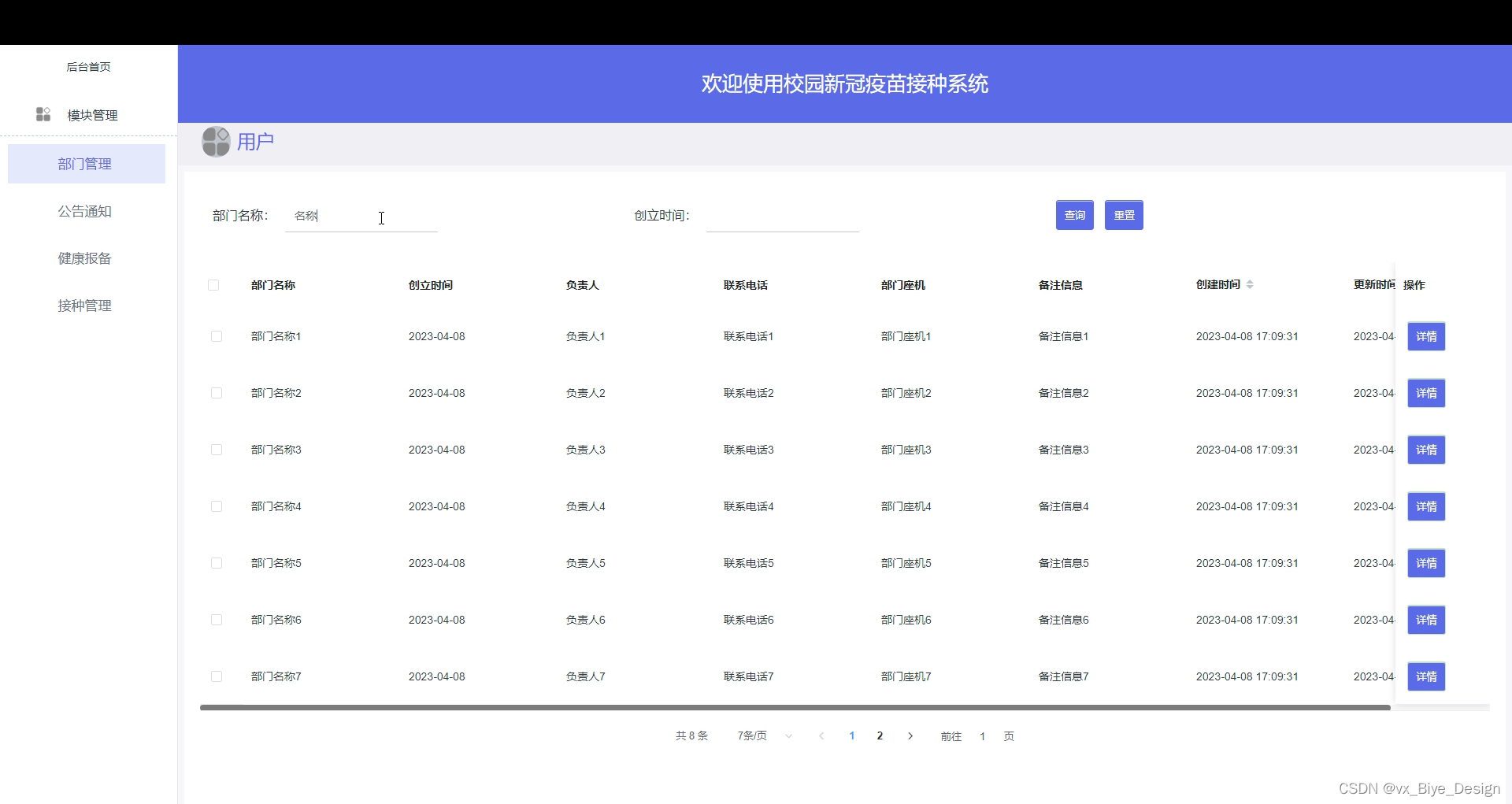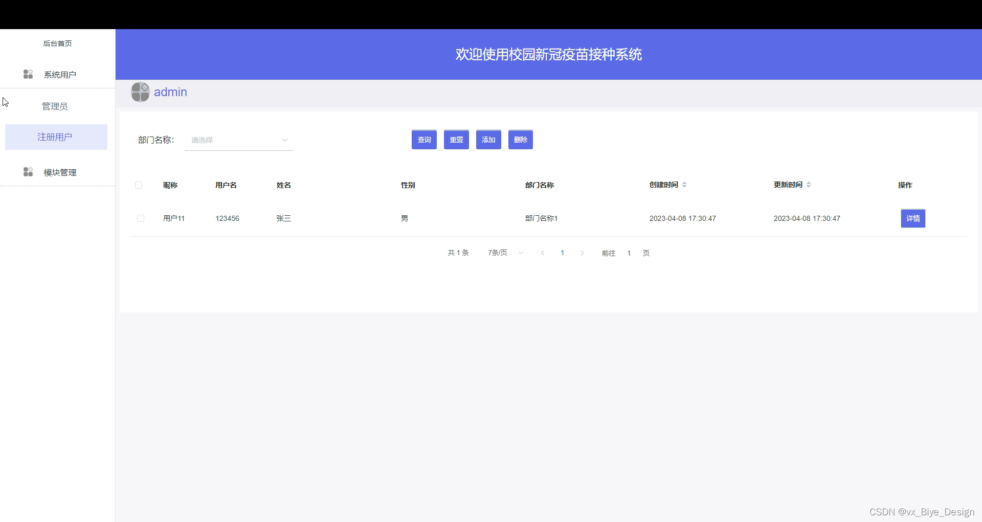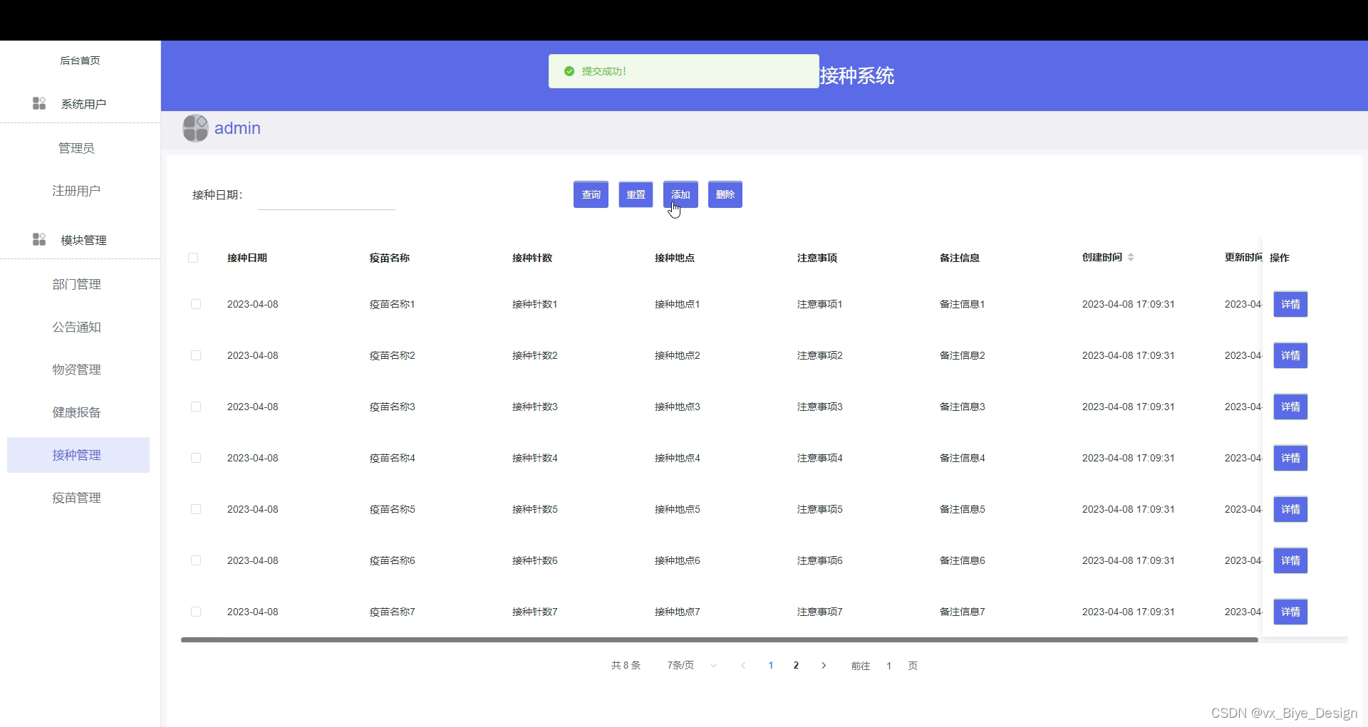 3、功能的完善性:后台首页,物资管理统计,疫苗管理统计,系统用户(管理员,注册用户),模块管理(部门管理,公共通知,物资管理,健康报备,接种管理,疫苗管理)等模块的修改维护操作。