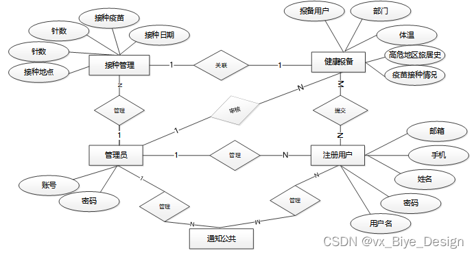 通过校园新冠疫苗接种系统的功能进行规划分成几个实体信息,实体信息将通过ER图进行说明,本系统的主要实体图如下: