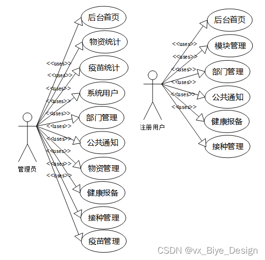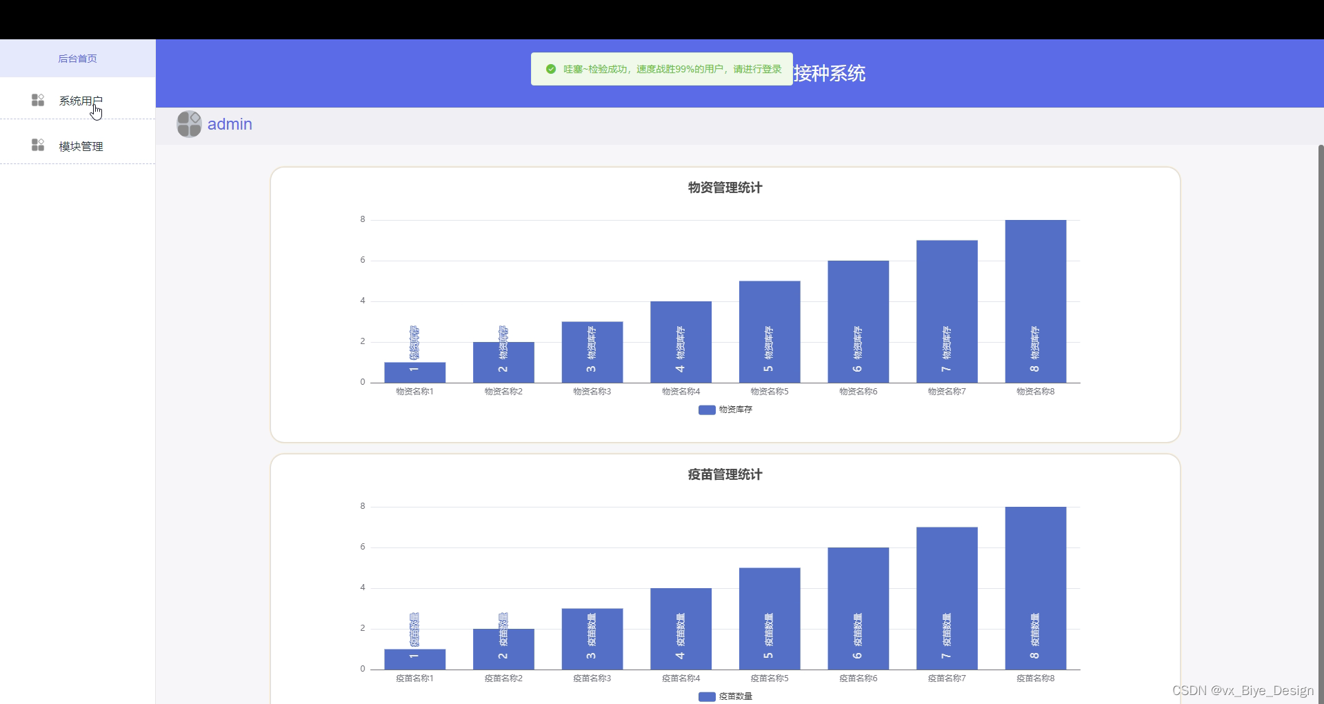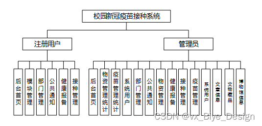 (1)功能要求:后台首页,物资管理统计,疫苗管理统计,系统用户(管理员,注册用户),模块管理(部门管理,公共通知,物资管理,健康报备,接种管理,疫苗管理)等功能模块。
