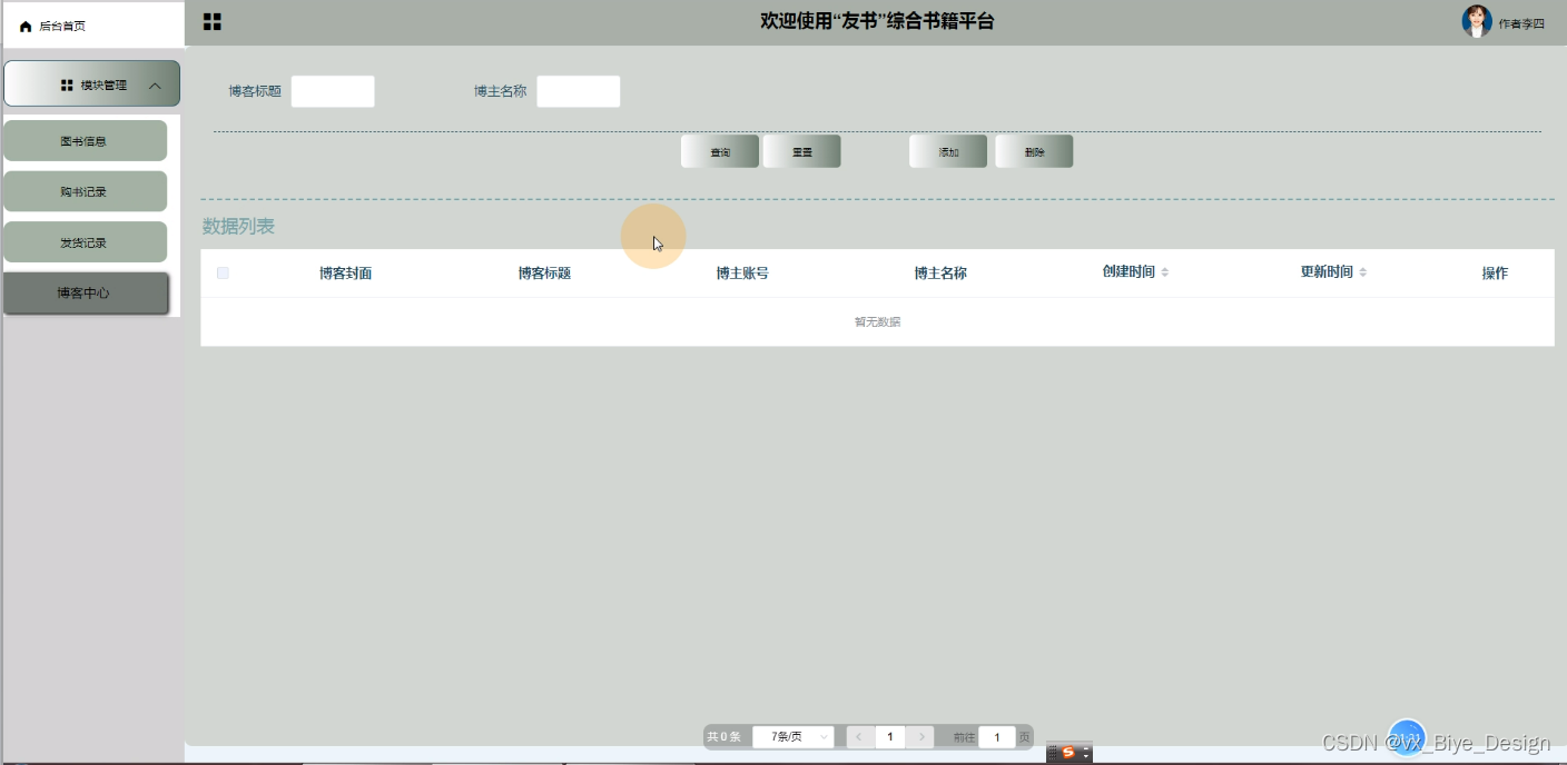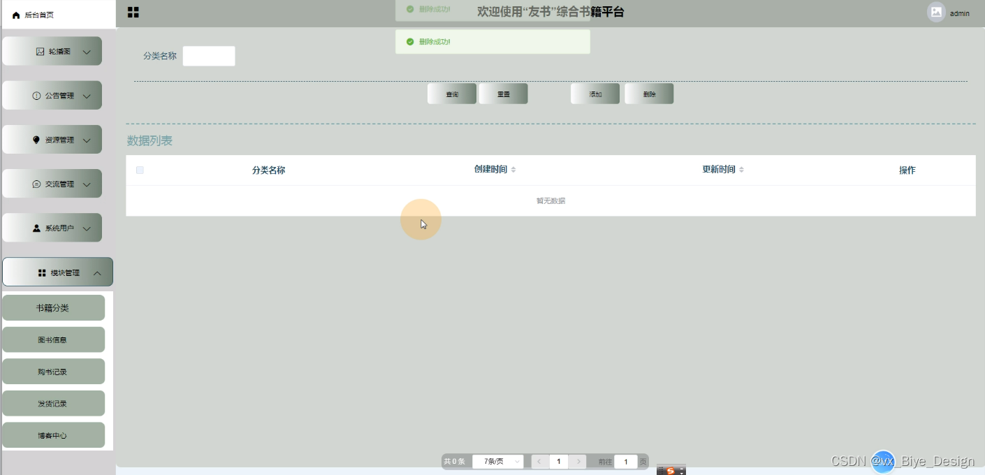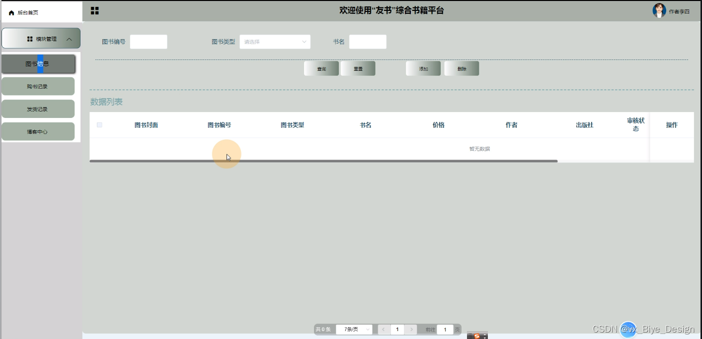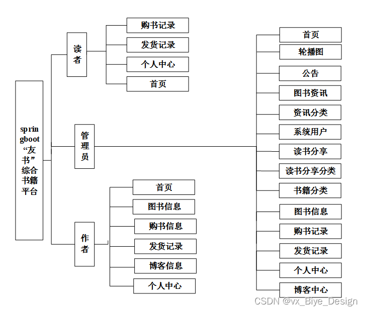 (1)功能要求:可以管理首页、轮播图(轮播图管理)、公告管理(公告)、资源管理(图书资讯、资讯分类)、交流管理(读书分享、读书分享分类)、系统用户(管理员、读者用户、作者用户)、模块管理(书籍分类、图书信息、购书记录、发货记录、博客中心)等功能模块。