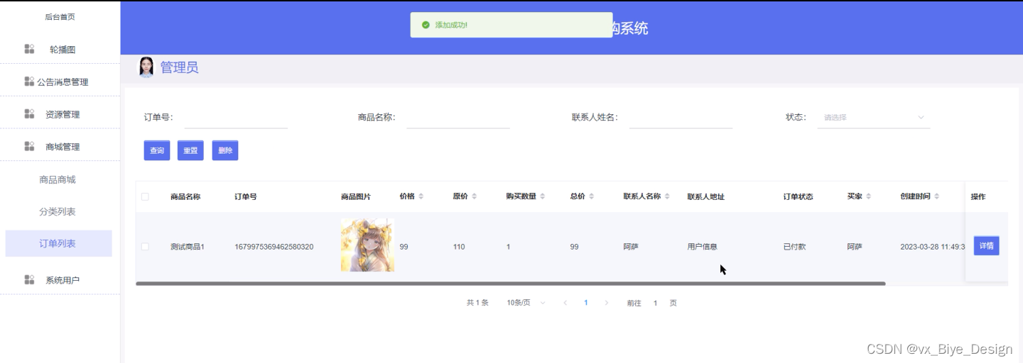 订单列表,在此页面可通过订单号、商品名称、联系人姓名、状态进行搜索查看用户下单订单详情,并可对订单信息进行删除等操作。如图5-6所示。