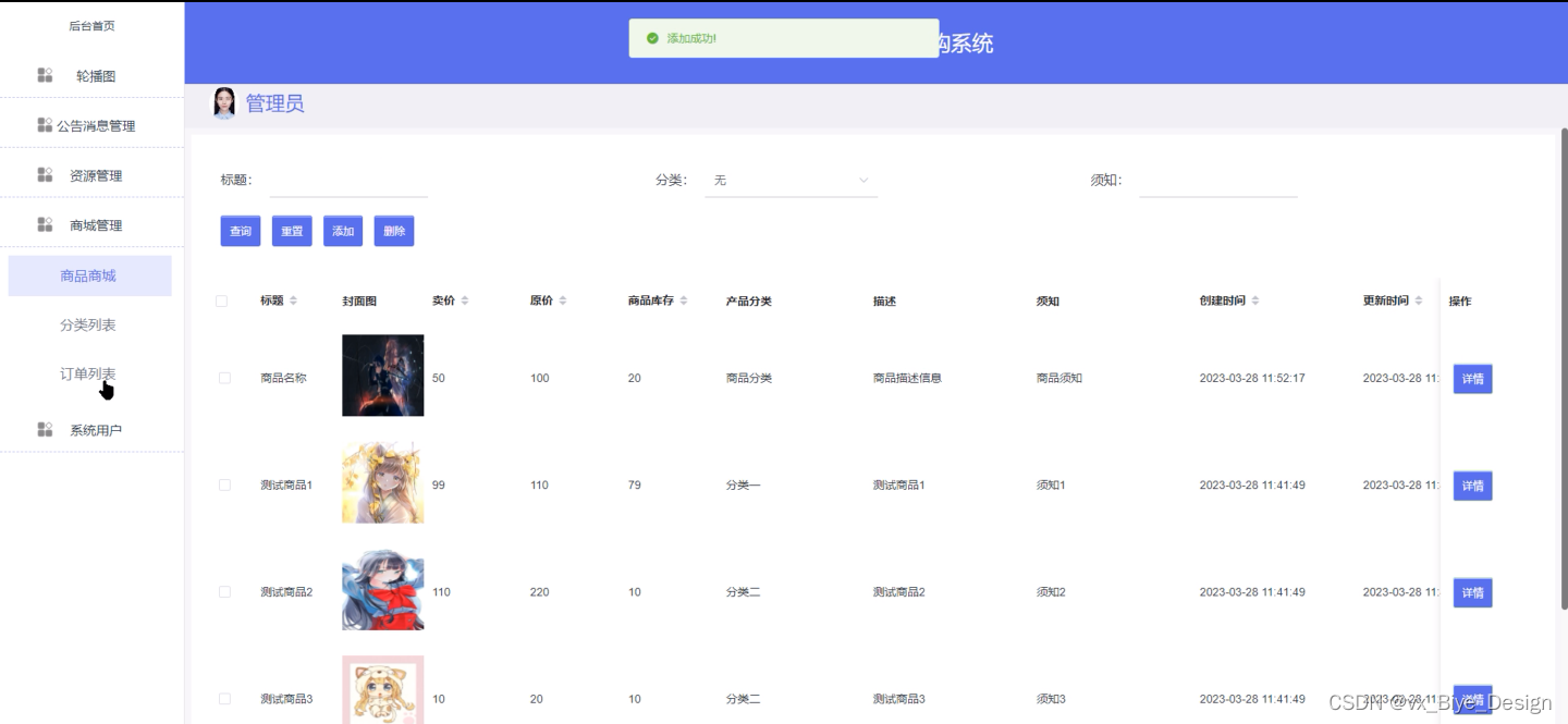 3、功能的完善性:拥有后台首页、轮播图管理、公告消息管理、商城管理(商品商城、分类列表、订单列表)、系统用户(管理员、普通用户)资源管理(动漫资讯、资讯分类)个人信息等功能的修改维护操作。