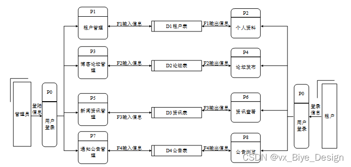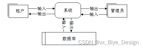 对系统的数据流进行分析,系统的使用者分为二类,租户,管理员。系统主要对界面信息传送,登录信息的验证,注册信息的接收,用户各种操作的响应做处理。