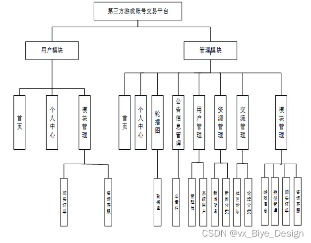 本第三方游戏账号交易平台主要包括两大功能模块,即管理员功能模块和用户模块。
