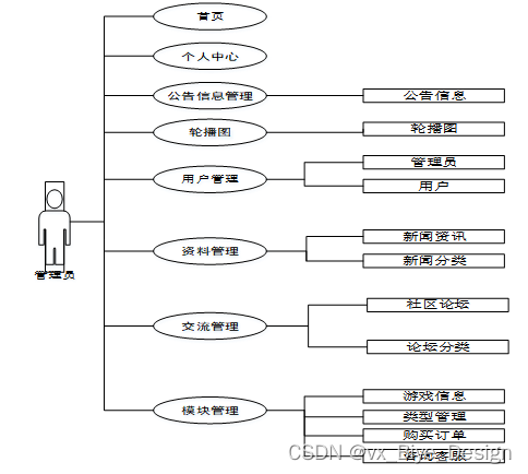 (1)管理员模块:系统中的核心模块是后台首页、个人中心、轮播图(轮播图管理)、公告信息管理(公告信息)、资源管理(新闻资讯、新闻分类)、交流管理(社区论坛、论坛分类)、系统用户(管理员、系统用户)、模块管理(游戏信息、类型管理、购买订单、咨询客服)等功能。管理员用例图如图3-1所示。