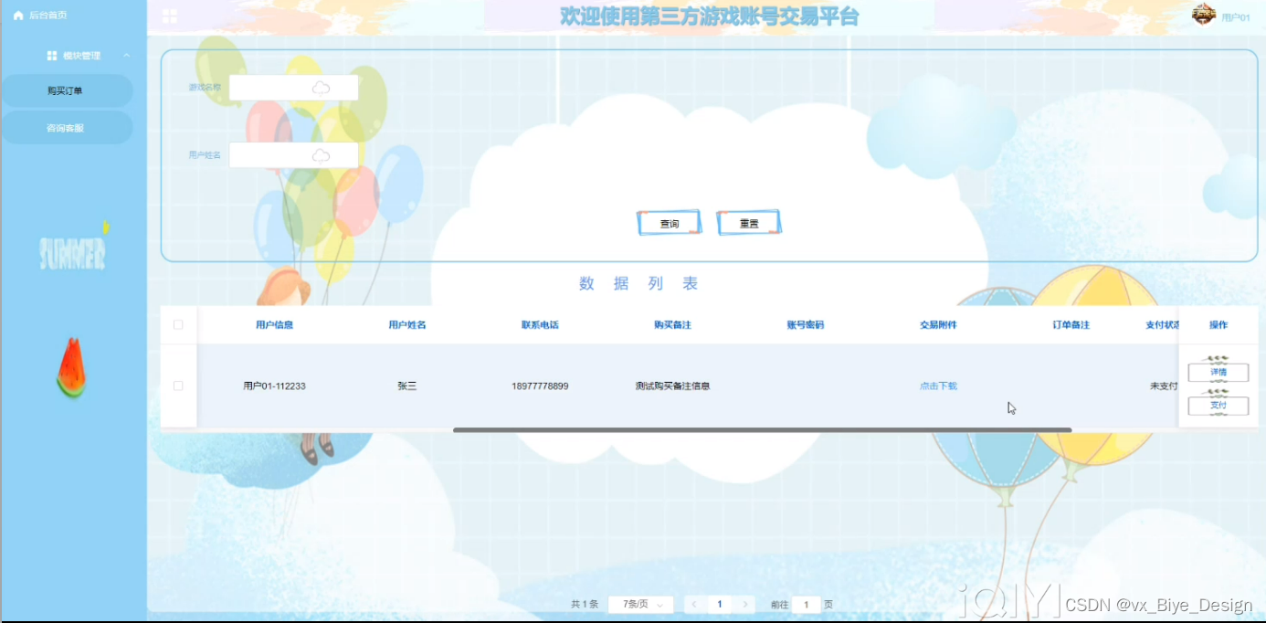 购买订单,在购买订单页面可以查看到用户信息、用户姓名、联系电话、购买备注、账户密码、交易附件、订单备注、支付状态等详情,并可根据需要进行支付等操作,如图5-11所示。