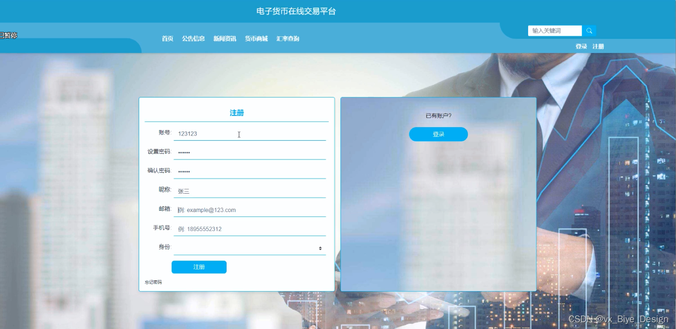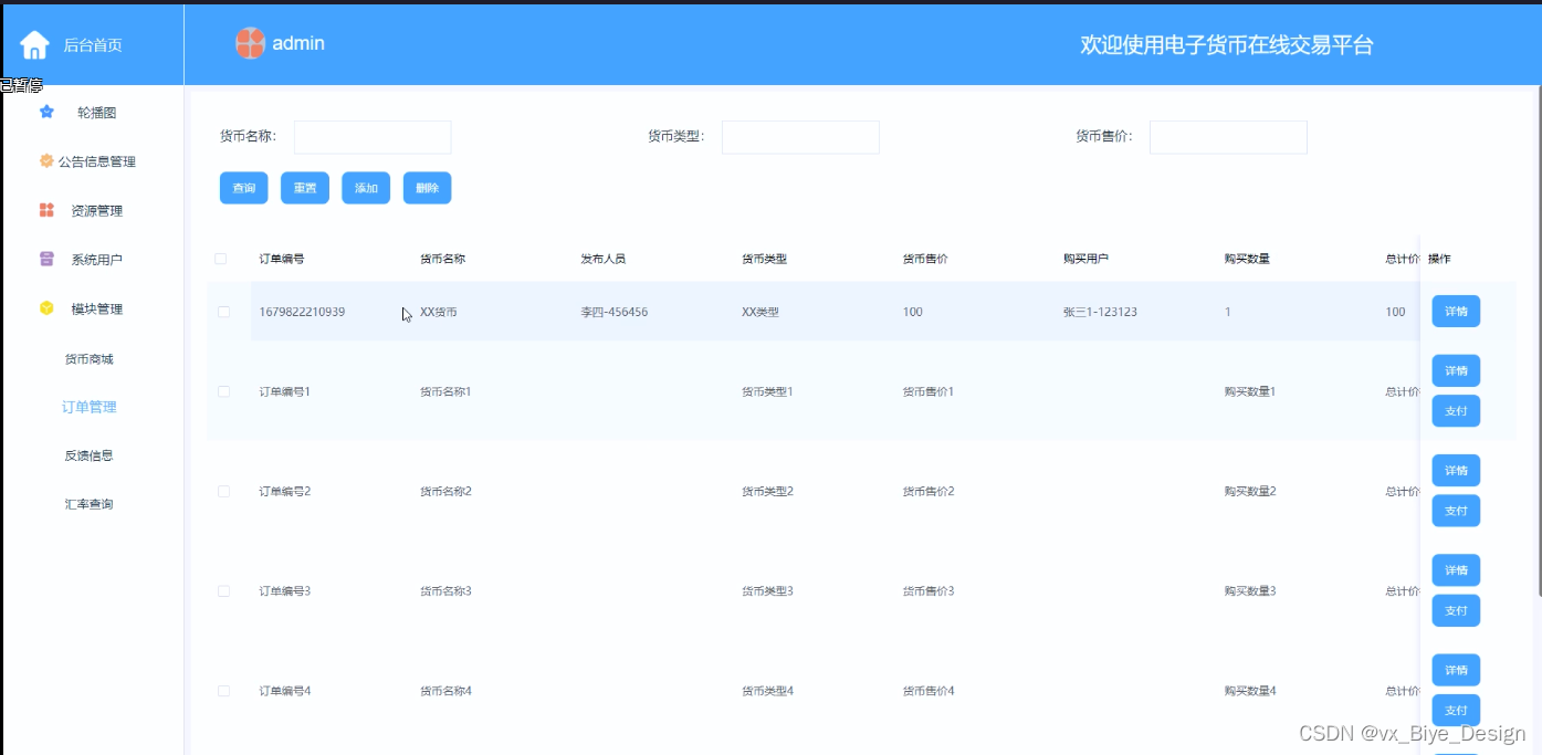 在本次电子货币在线交易平台中,利用了目前市场上普遍使用的Java技术,以及数据库管理功能MySQL,和目前比较流行的springboot框架,最后配合使用到了VUE页面布局技术进行系统界面的布置,以现实生活的用户运动过程为标准,设计实现了公告查询、资讯浏览、汇率查询、货币商城、点赞收藏、在线评论等功能,并维护好后台的信息和整体系统的稳定性。
