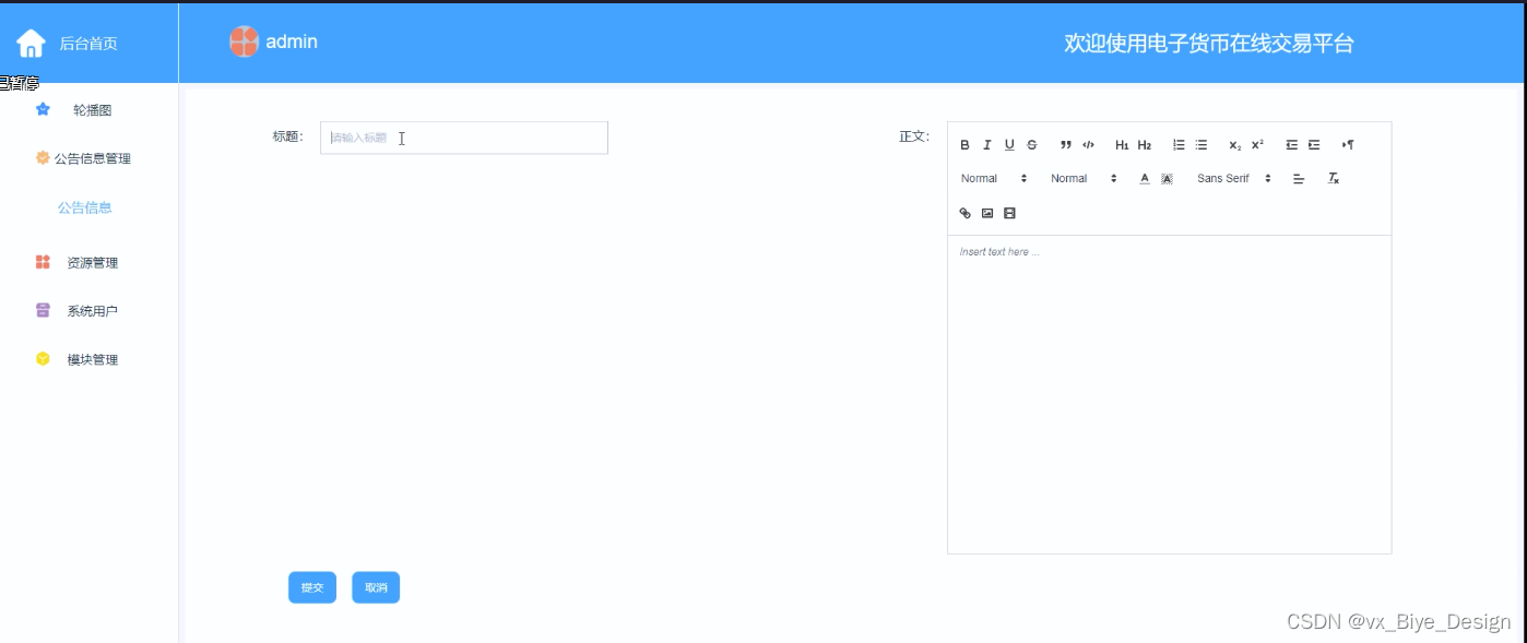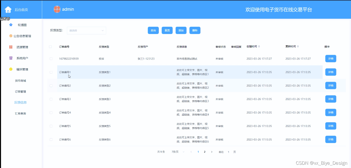 电子货币在线交易平台主要功能模块包括用户管理、货币商城、订单管理、反馈信息、汇率查询等功能,采取面对对象的开发模式进行软件的开发和硬体的架设,能很好的满足实际使用的需求,完善了对应的软体架设以及程序编码的工作,采取MySQL作为后台数据的主要存储单元,采用springboot框架Java语言、进行业务系统的编码及其开发,实现了本系统的全部功能。本次报告,首先分析了研究的背景、作用、意义,为研究工作的合理性打下了基础。针对电子货币在线交易平台的各项需求以及技术问题进行分析,证明了系统的必要性和技术可行性,然后对设计系统需要使用的技术软件以及设计思想做了基本的介绍,最后来实现电子货币在线交易平台和部署运行使用它。