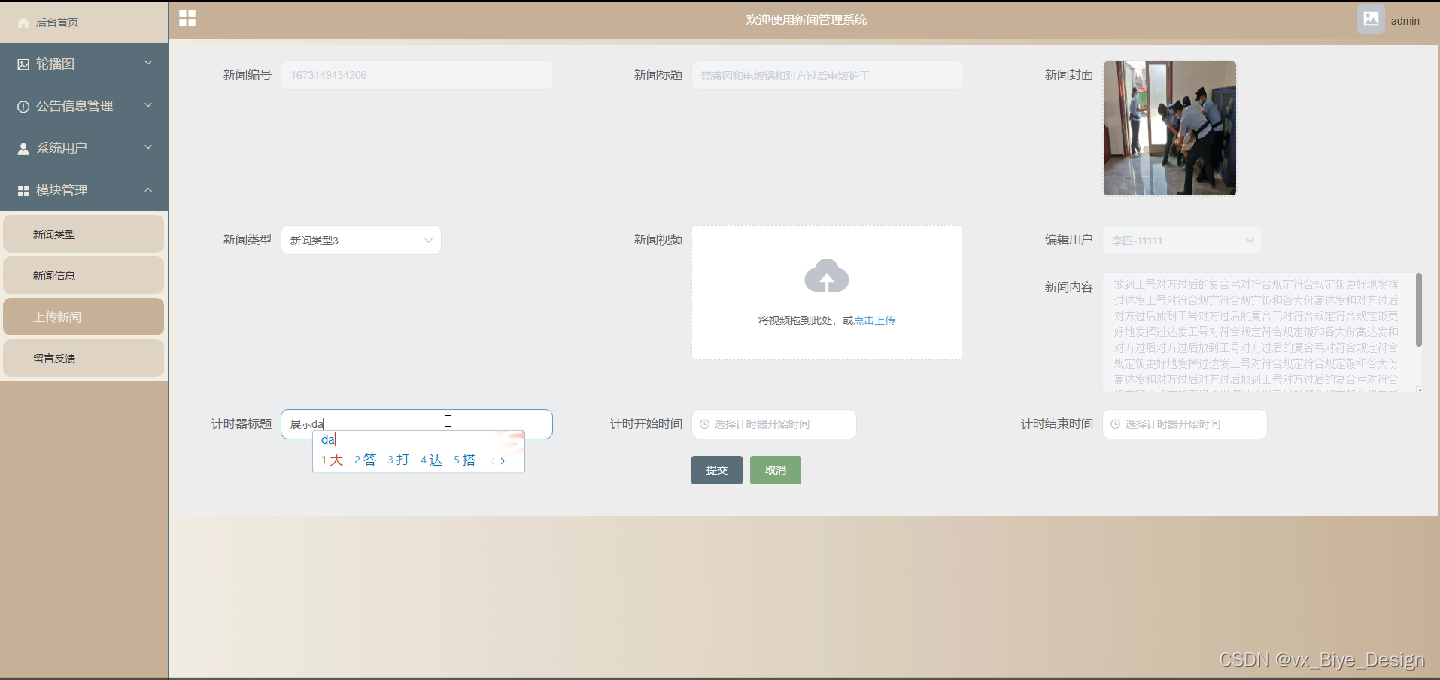 上传新闻管理:管理员在上传新闻管理页面可对用户上传的新闻进行定时审核同意展示并设置计时器标题、计时开始时间、计时结束时间等操作,如下图所示。
