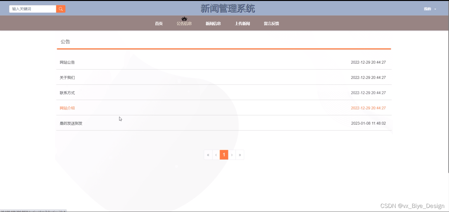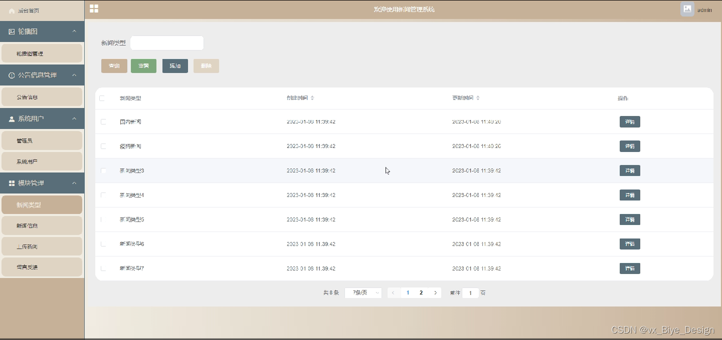 The main users of the news management system are divided into administrators and system users. The implementation functions include homepage rotation chart management, announcement information management, system user management, news information, news type, upload news, message feedback, and other functions.