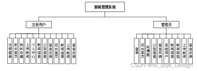 新闻管理系统的功能主要分为用户查看公告信息、新闻信息、上传新闻、留言反馈等。管理员对轮播图管理、公共信息管理、新闻类型管理、新闻信息管理和用户的留言反馈、上传的新闻等进行更加方便快捷的管理。