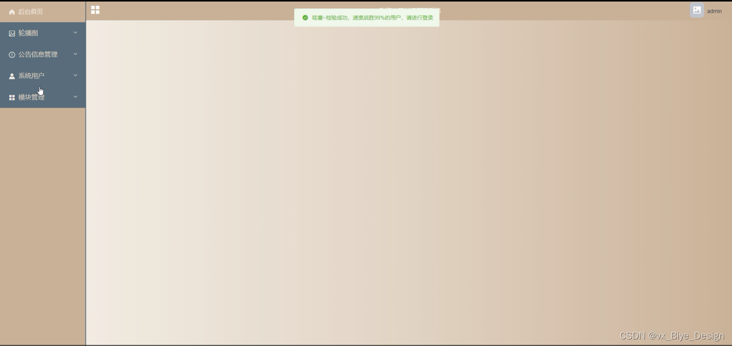 管理员登录进入新闻管理系统 可以查看后台首页,轮播图管理,公告信息管理,系统用户(管理员,系统用户),模块管理(新闻类型、新闻信息、上传新闻、留言反馈)等信息,如下图所示。