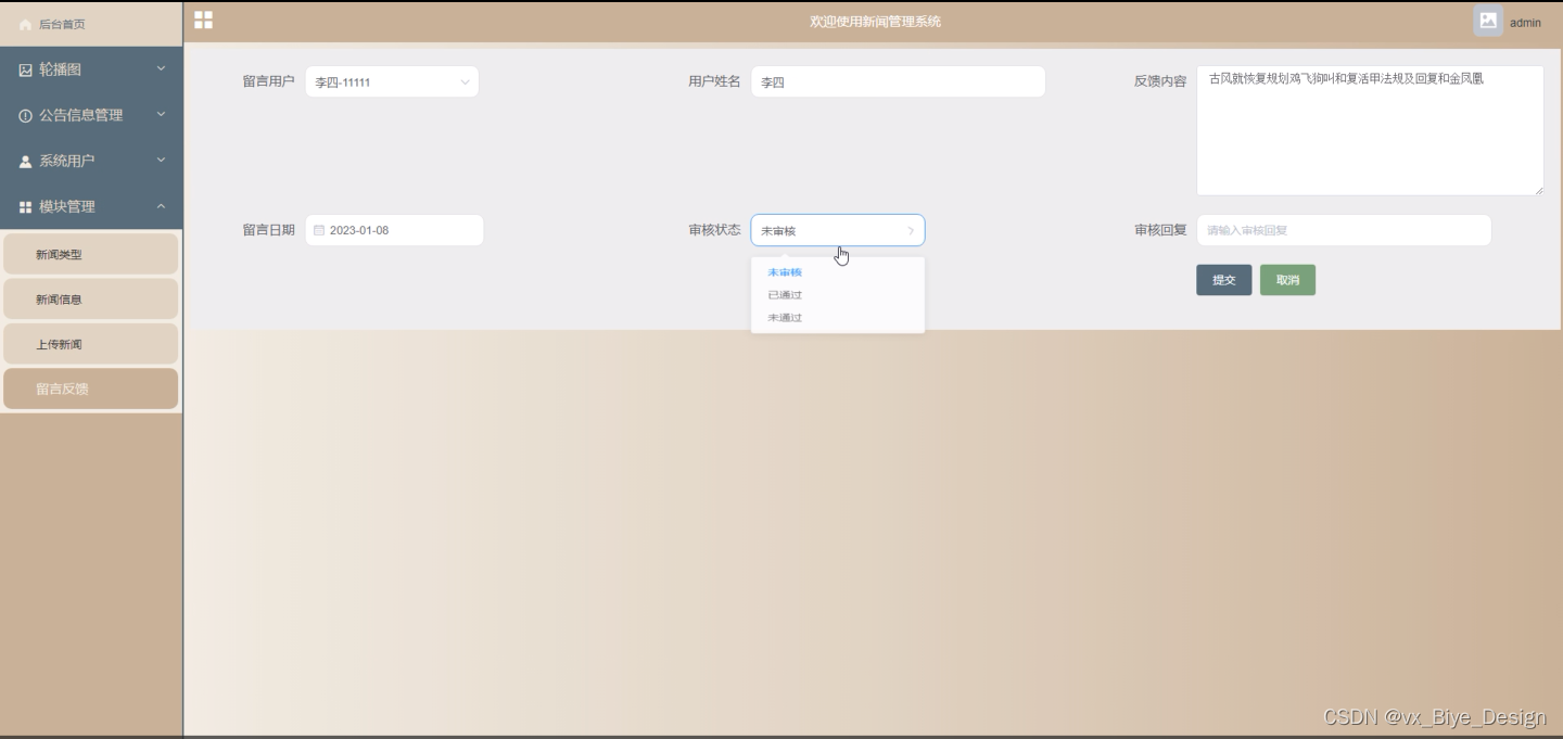 模块管理对新闻类型、新闻信息、上传新闻、留言反馈等进行维护操作。