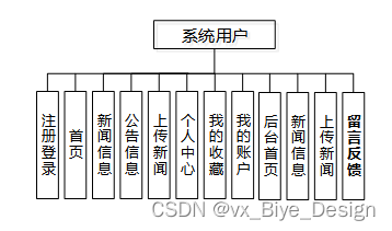 新闻管理系统 的主要使用者分为管理员、系统用户,实现功能包括首页轮播图管理,公告信息管理、系统用户管理、新闻信息、新闻类型、上传新闻、留言反馈等功能。