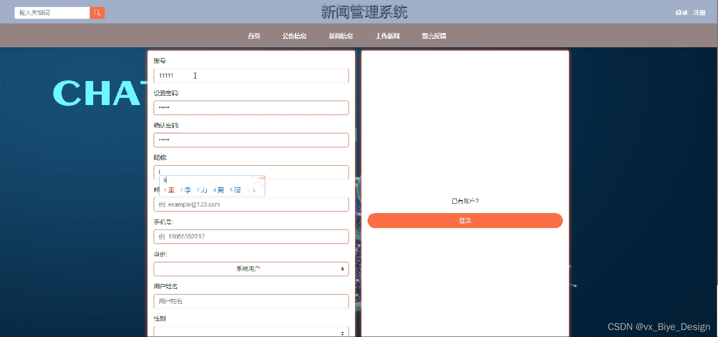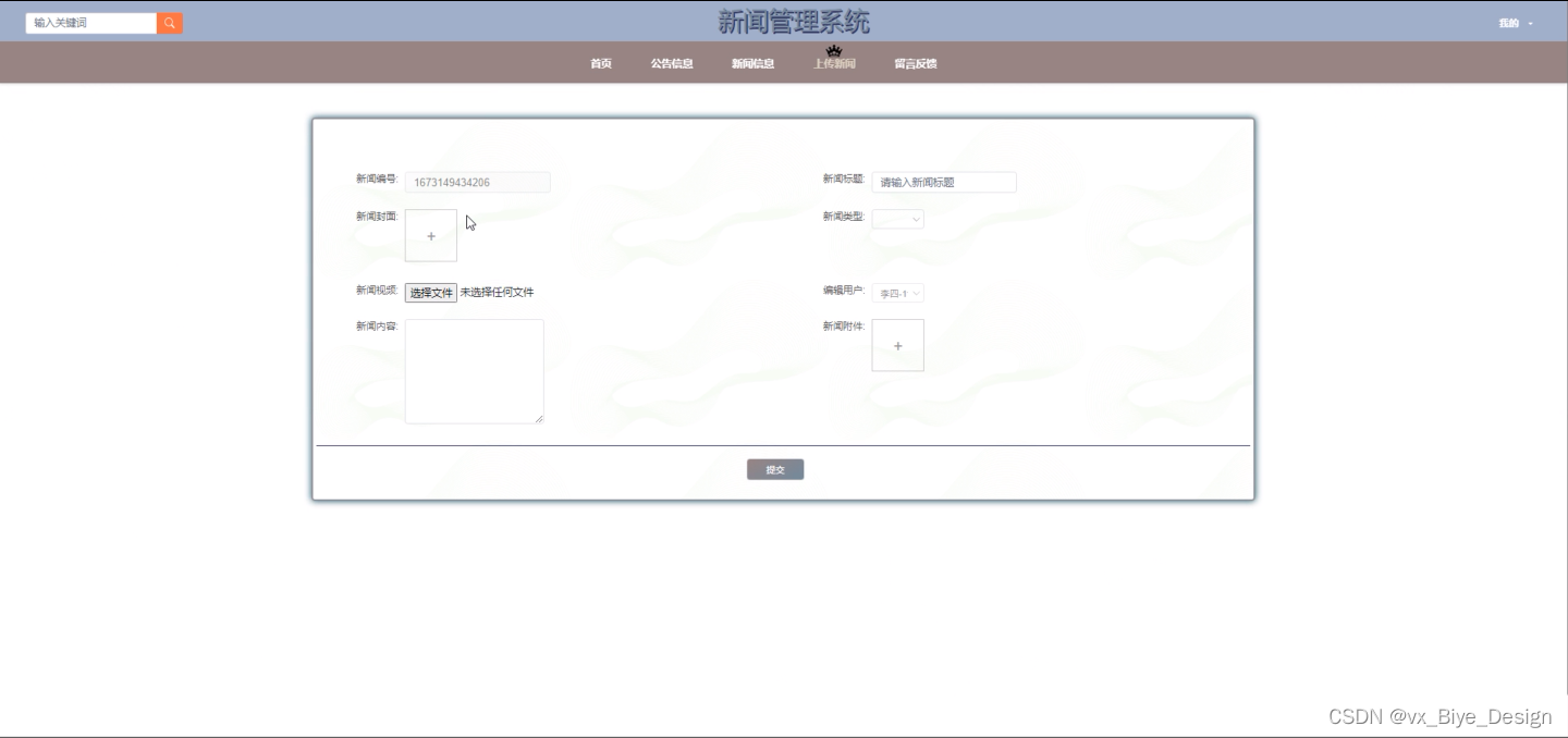 上传新闻:用户可在上传新闻这一栏编辑新闻编号、新闻标题、新闻类型、新闻封面、上传新闻视频、新闻内容、新闻附件等详细信息进行提交,等待管理审核通过后台在首页显示,如下图所示。