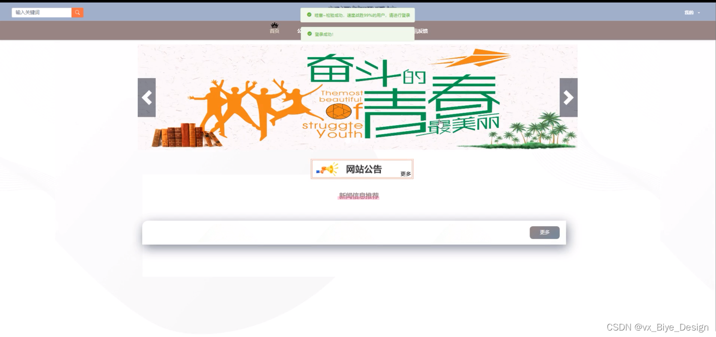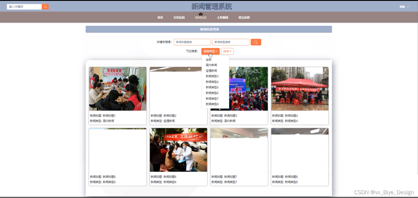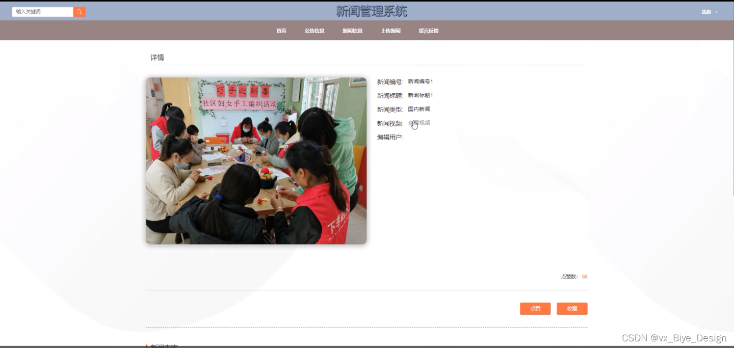 新闻信息,在此页面可以通过关键字或者下拉搜索查看新闻信息,对喜欢的文章可以进行收藏,点赞,评论,等操作,浏览后首页会进行推荐该类型新闻,如下图所示。