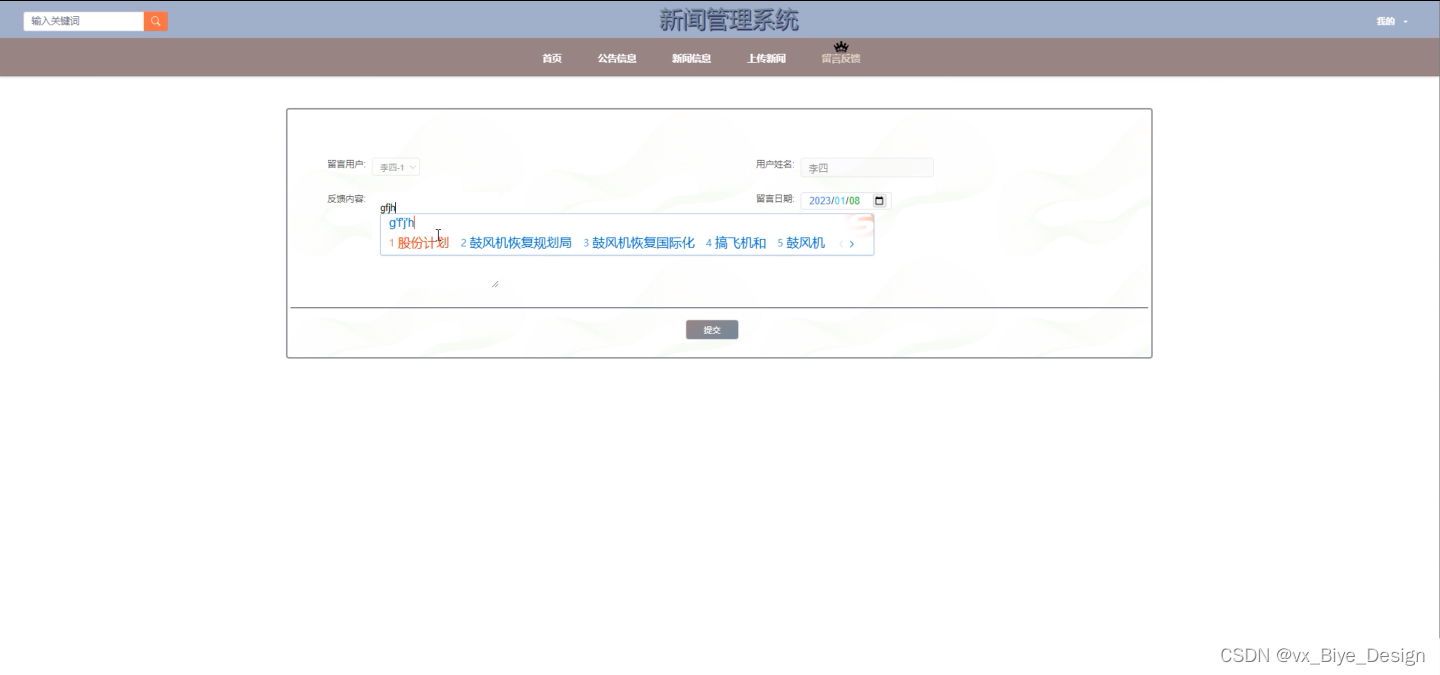 留言反馈,用户在此页面可编辑反馈内容和留言日期进行提交反馈信息,如下图所示。