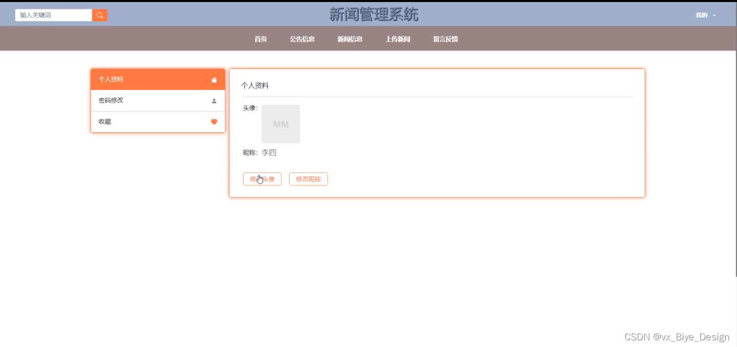 新闻管理系统 ,在系统首页可以首页,公告信息,新闻信息,上传新闻,留言反馈,我的(我的账户,我的收藏,个人中心)等内容,如下图所示。