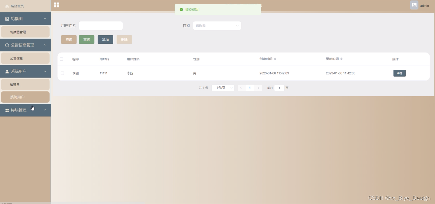 系统用户,在此页面中可以查看用户名,昵称,性别、用户姓名等信息,并可根据需要进行重置,删除,新增等操作,如下图所示。