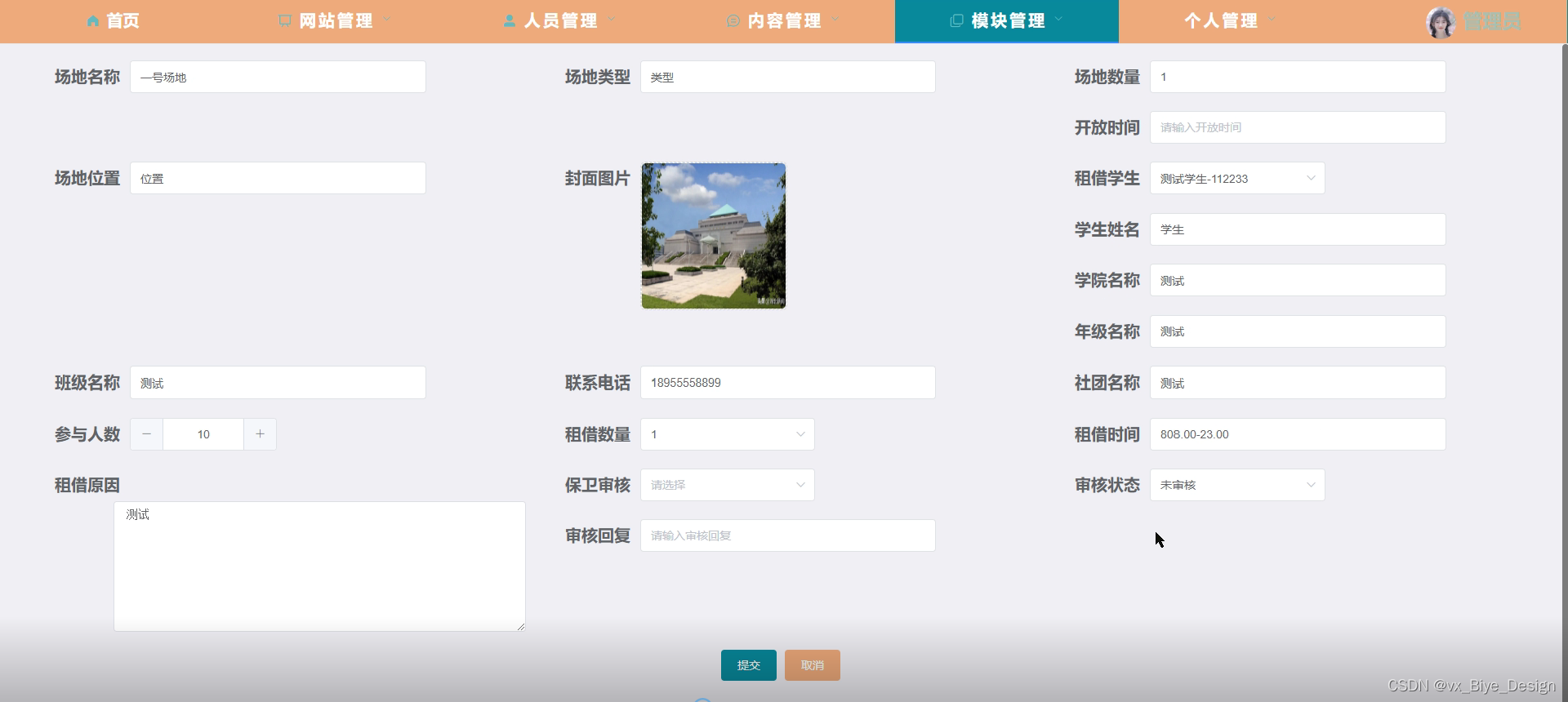 场地租借管理,管理员可以对学生提交的租借申请进行审核回复,如图4-8所示。