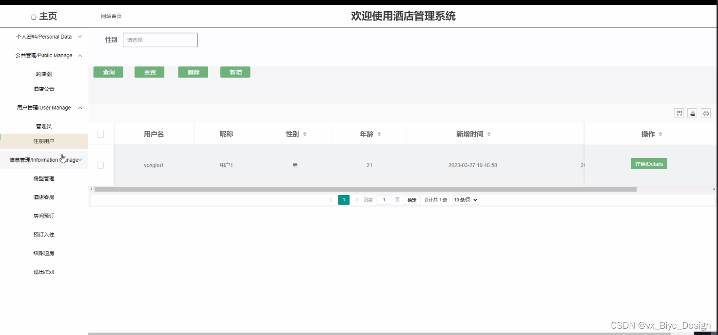 本系统主要包含了首页、个人资料、公共管理(轮播图、酒店公告)用户管理(管理员、注册用户)信息管理(酒店资讯、资讯分类)房型管理、酒店客房、房间预订、预订入住、结账退房等多个功能模块。下面分别简单阐述一下这几个功能模块需求。