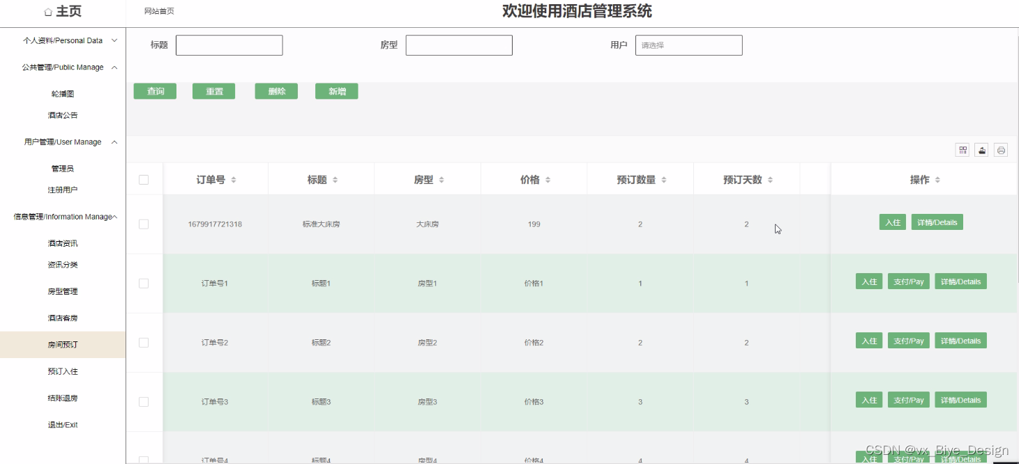 用户选择客房添加客房订单记录,管理员审核客房订单信息,管理员所以用户的客房订单记录。