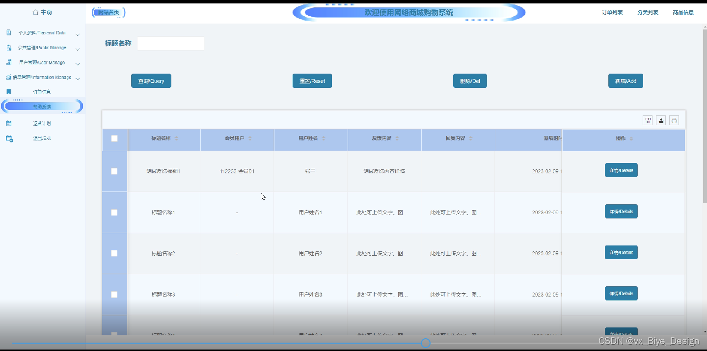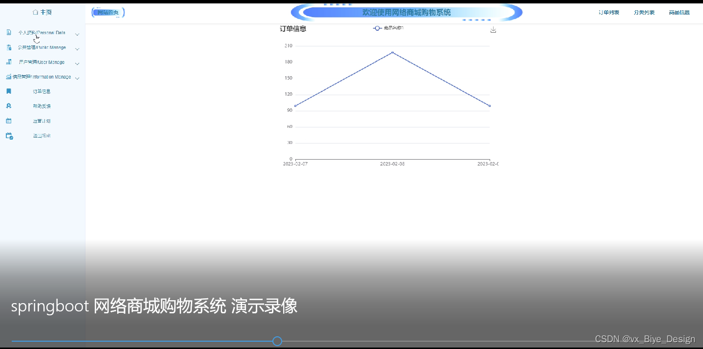 3、功能的完善性:拥有首页、公共管理(公告信息,轮播图)信息管理(商城资讯、资讯分类),订单信息、帮助反馈、运营计划、订单列表、分类列表、商品信息、个人资料等模块的修改维护操作。