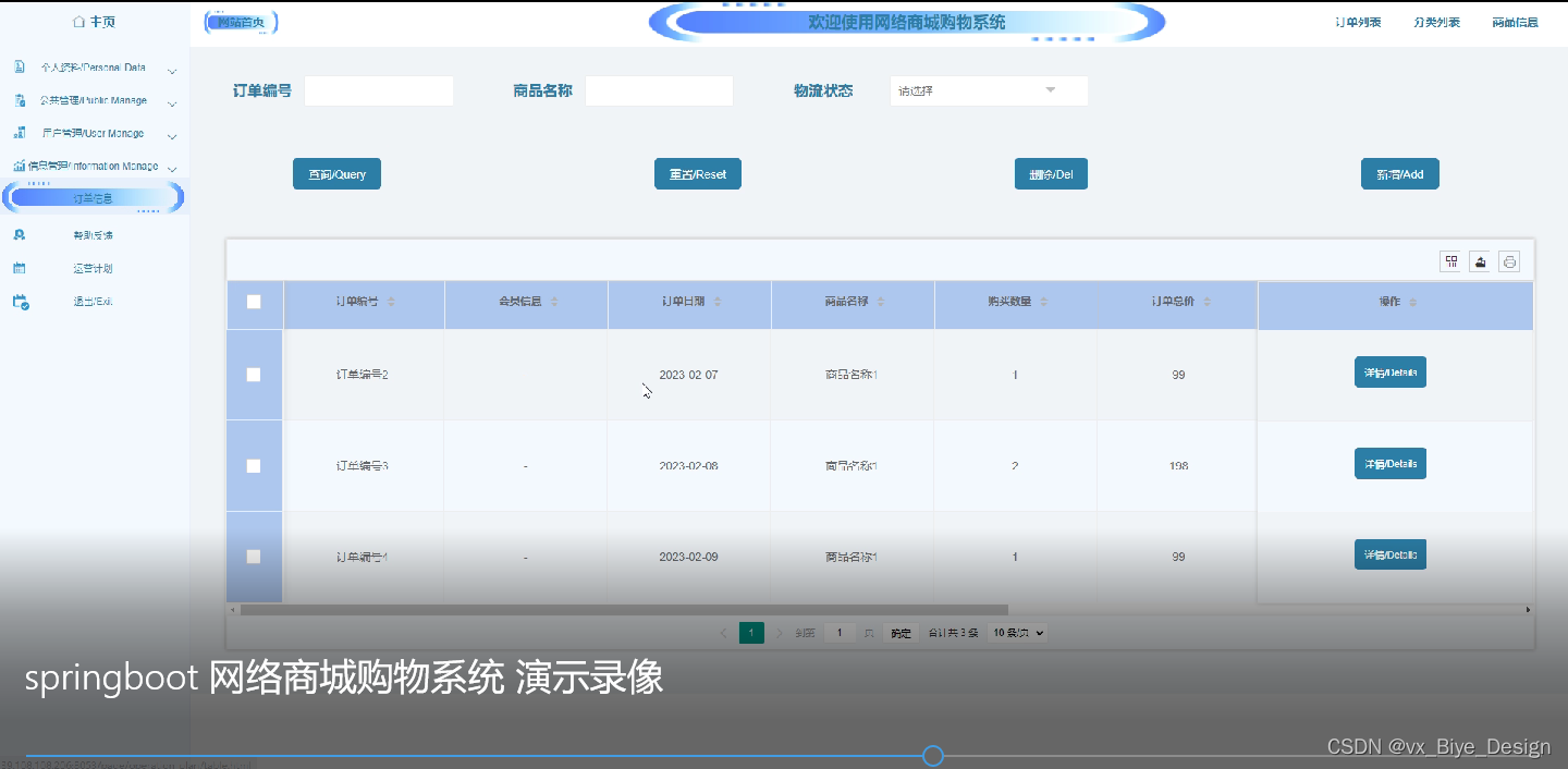 订单信息,在此页面可通过订单编号、商品名称、物流状态进行搜索查看订单信息,并可对订单的信息进行分类、增加、删除等操作。如图5-6所示。