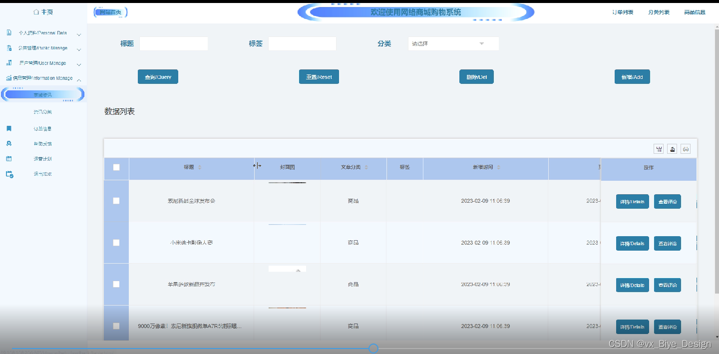 商城资讯:在此页面可通过标题、标签、分类进行搜索查看商城资讯信息,并可根据需要进行增加、删除、重置等操作,如图5-4 5-5所示。