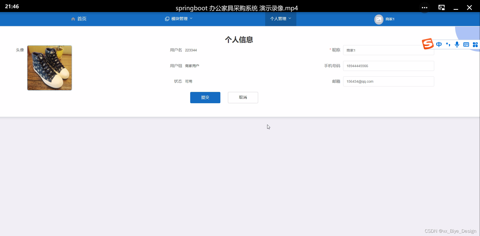 个人中心,在个人中心页面中通过填写用户名、密码、姓名、性别、头像、手机、邮箱、余额等信息进行提交,如图4-10所示。