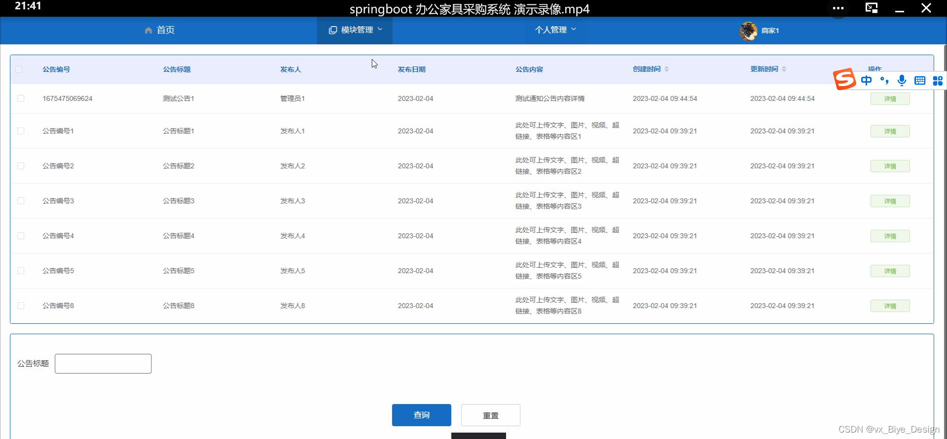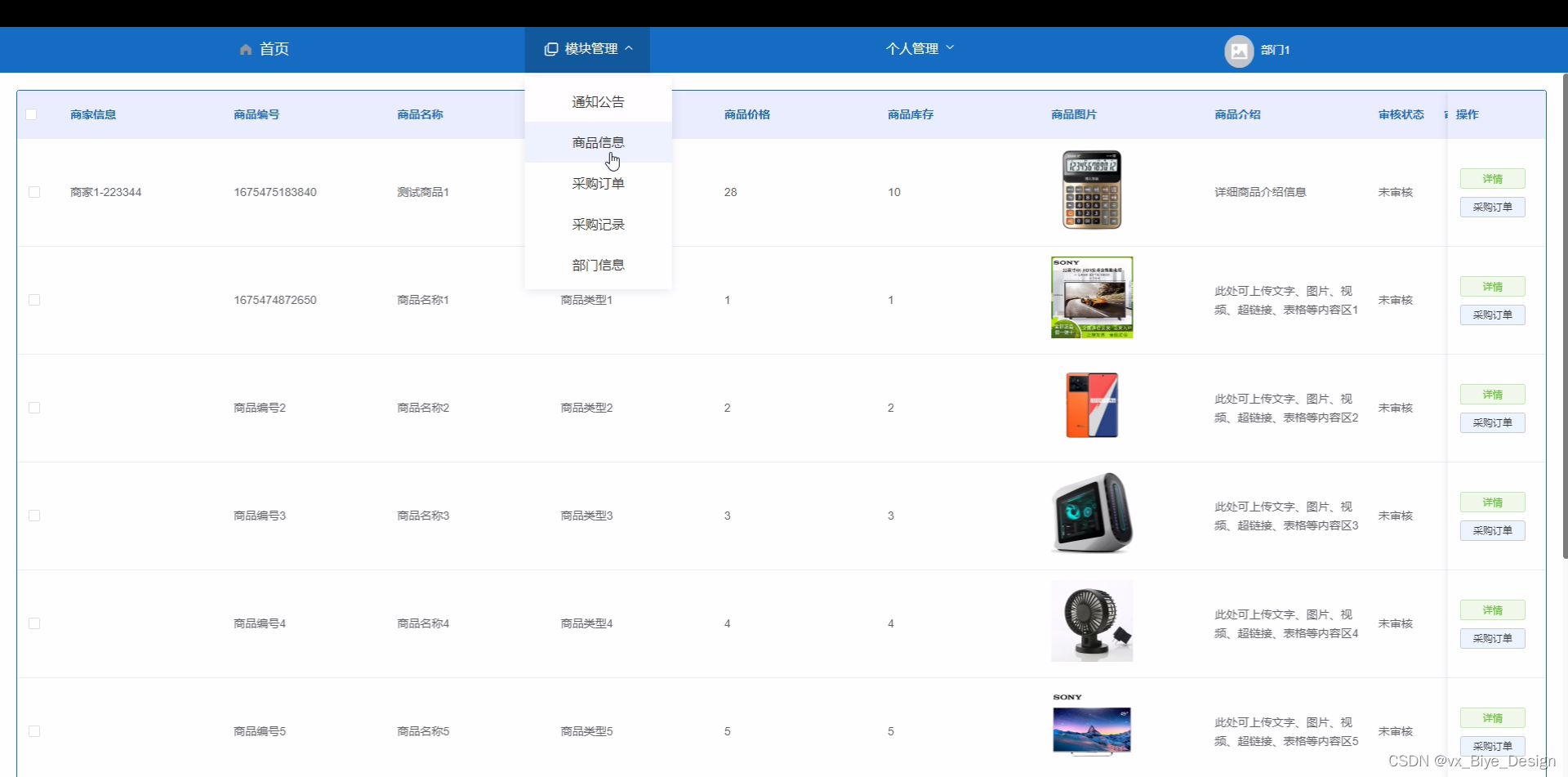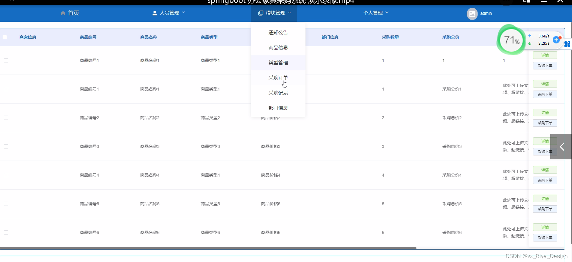 2. 系统功能还不够完善,无法提供丰富多彩的在线功能,只能实现通知公告、商品信息、类型管理、采购订单、采购记录、部门信息等一系列功能。