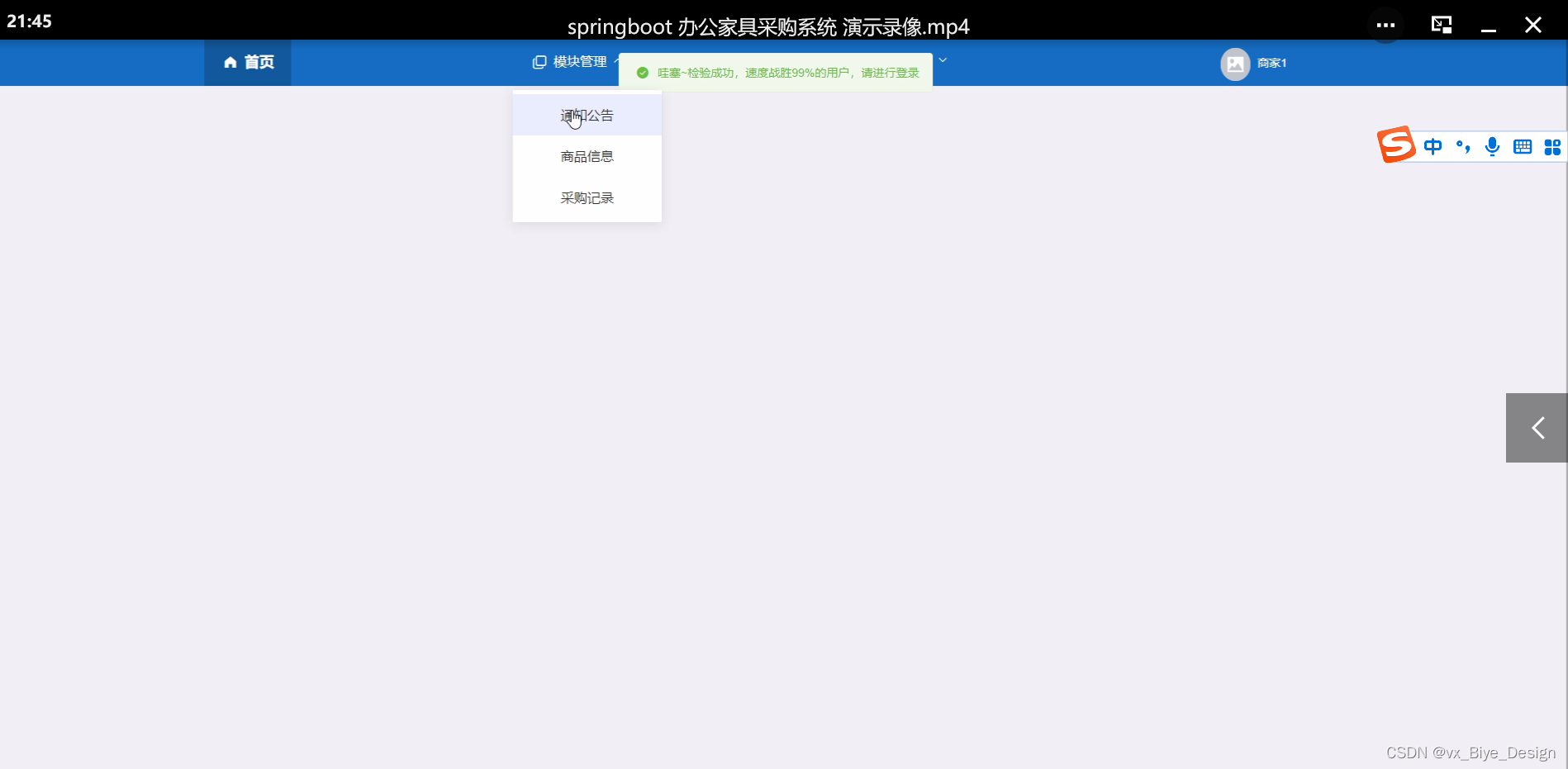 商家登录进入平台可以查看首页、通知公告、商品信息、采购记录、个人管理等内容进行详细操作,如图4-9所示。