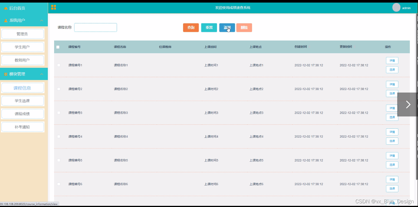 This design mainly realizes the design of student information management system with the advantages of humanization, high efficiency and convenience, and completes the system management of super administrator: home page, system user (administrator, student user, teacher user) module management (course information, student course selection, course score, make-up examination notice). Teacher: Home page, course information, student course selection, course results, make-up notice. Students: Home page, process information, student course selection, course scores, make-up examination notice, the system communicates with the server through the browser to achieve data interaction and change. With a computer, you can operate the system by moving your finger to achieve data communication management. The design process of the whole system fully considers the security, stability and reliability of data, and the operation process is simple. The system improves work efficiency and reduces errors and omissions in data storage through scientific management and convenient services.