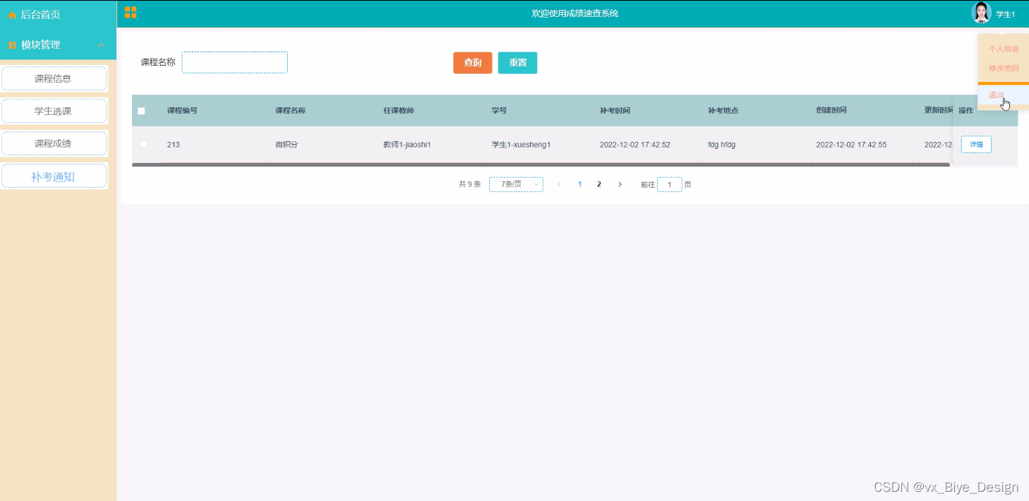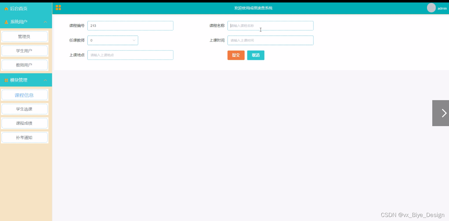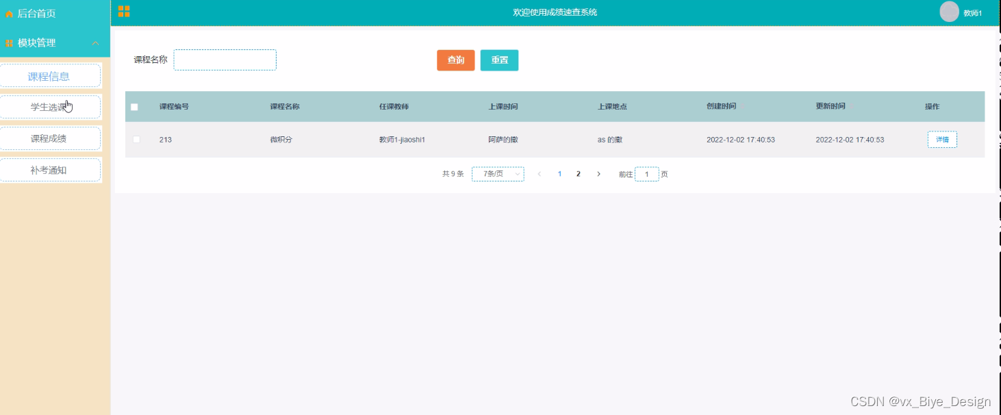 查找课程信息时,输入需要查找的课程信息名,调用getData方法获取所有数据并且进行分页,把获取到的所有数据显示到视图上,这时候只需要用脚本方法便能快速查找,不涉及对数据库操作。