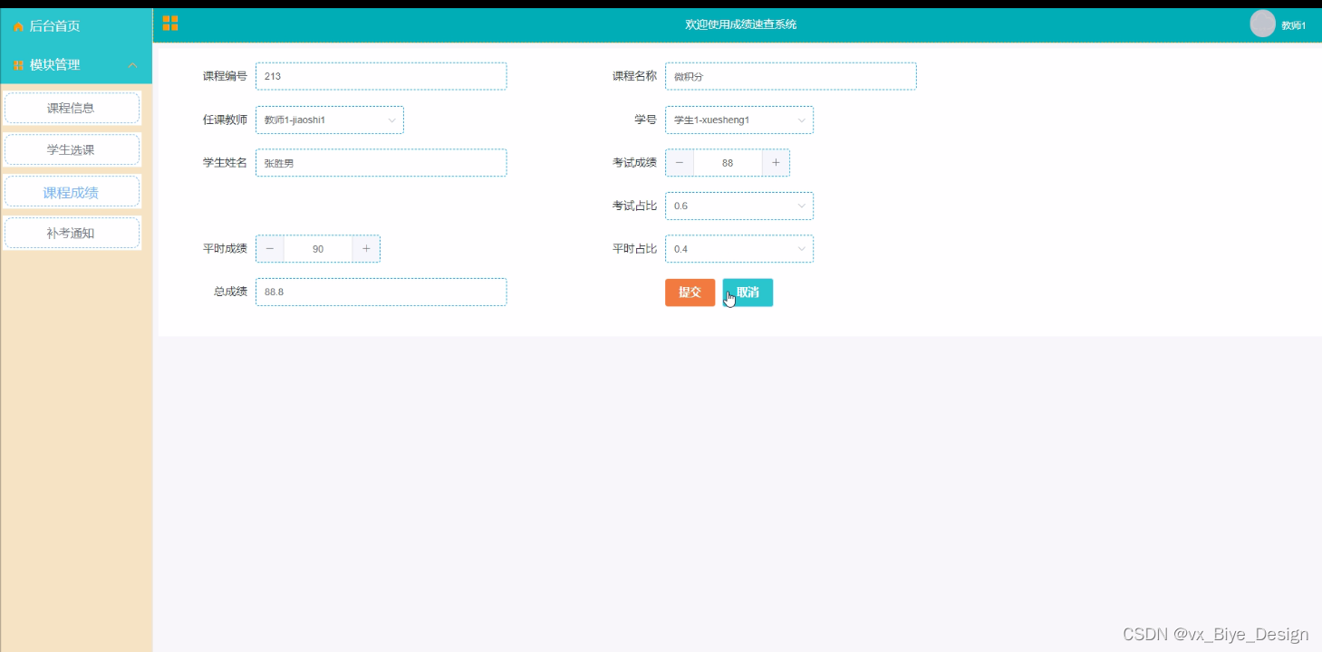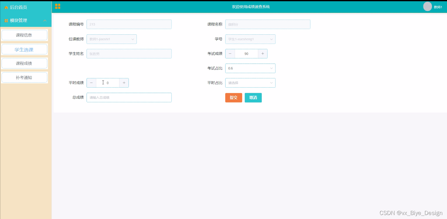 本设计主要实现集人性化、高效率、便捷等优点于一身的成绩速查管理系统设计,完成超级管理员:首页、系统用户(管理员、学生用户、教师用户)模块管理(课程信息、学生选课、课程成绩、补考通知)系统管理。教师:首页、程信息、学生选课、课程成绩、补考通知。学生:首页、程信息、学生选课、课程成绩、补考通知、系统通过浏览器与服务器进行通信,实现数据的交互与变更。只需通过一台电脑,动动手指就可以操作系统,实现数据通信管理。整个系统的设计过程都充分考虑了数据的安全、稳定及可靠等问题,而且操作过程简单。本系统通过科学的管理方式、便捷的服务提高了工作效率,减少了数据存储上的错误和遗漏。