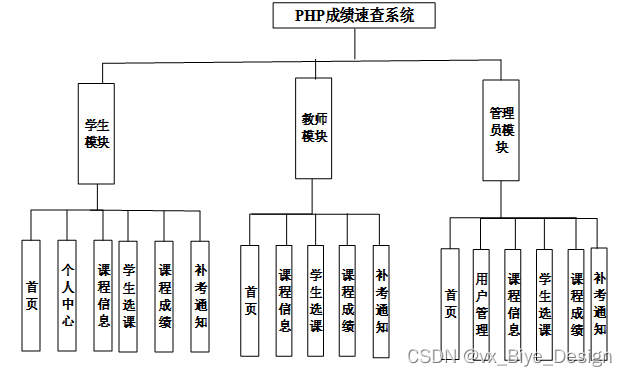系统设计的目的是分析系统包括的所有功能结构,为开发人员设计开发和实现系统做好准备工作。经过前期的需求调查、分析和整理之后,确定的总体需求主要包括多个模块,分别是:首页、系统用户(管理员、学生用户、教师用户)模块管理(课程信息、学生选课、课程成绩、补考通知)管理。系统整体角色分为三个部分,一是学生、二是教师、最后是管理员。权限分布也是很明显,学生教师是在除去浏览信息之外还具有查询和管理自己账户信息权限;管理员是最高权限拥有者。