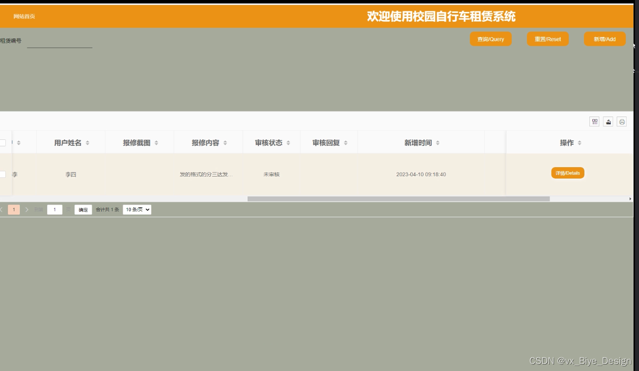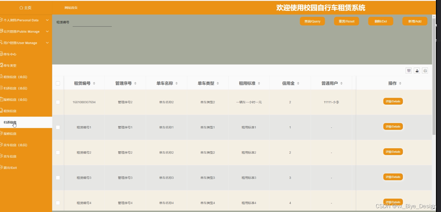 单车租赁管理:可以查看租用号、管理序号、单车名称、单车类型、租用单价、租用标准、信用金、普通用户等信息,可以进行查询、删除、新增等操作,如下图所示。