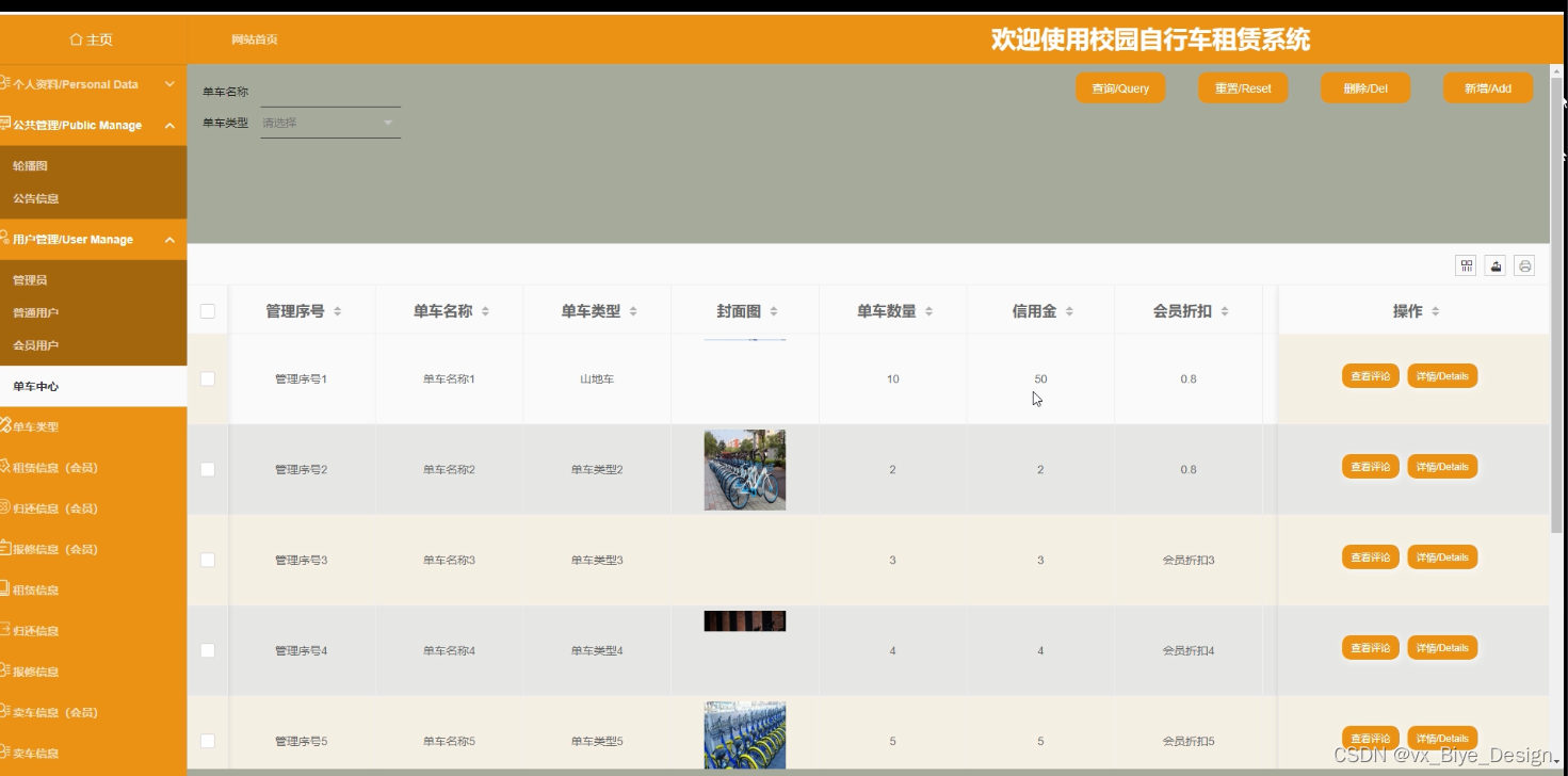 单车中心:可以查看单车的管理序号、单车名称、单车类型、封面图、信用金、租用单价、单车数量、租用标准等信息。可以进行查询、新增、删除、修改等操作,如下图所示。