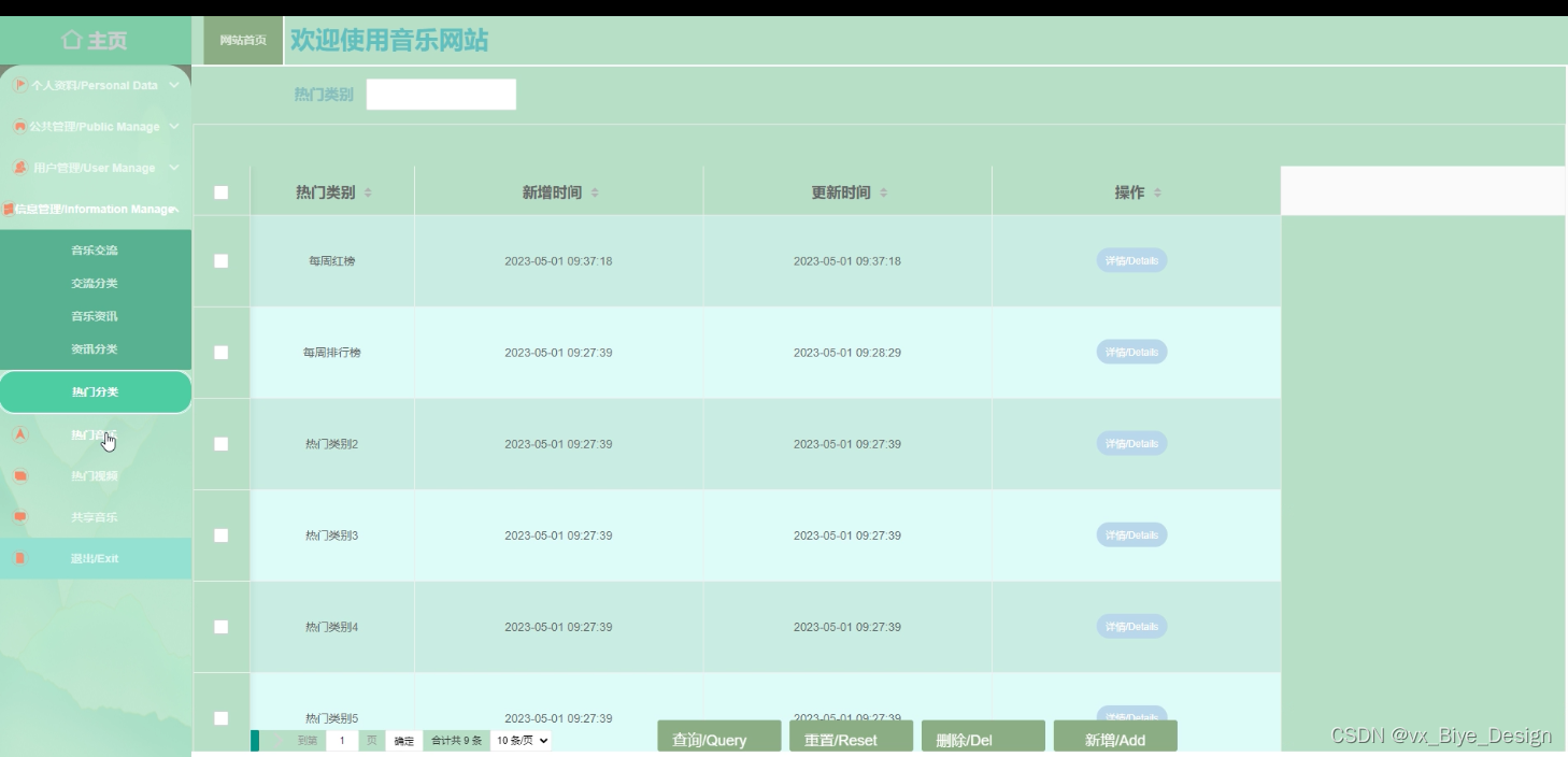 热门音乐,在热门音乐页面图可以对热门音乐添加信息:歌曲名称、热门类别、歌手、发行日期、音频、封面等内容,并可在热门音乐管理查询、编辑、删除、详细等操作,如图5-6所示: