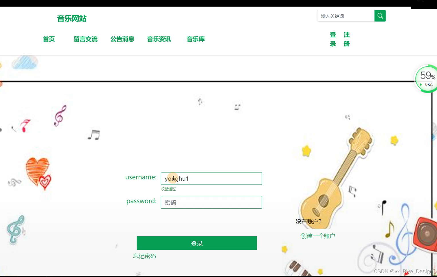 系统前台功能,用户登录页面可游览系统首页、交流论坛、网站公告、音乐资讯、热门音乐、热门视频、共享音乐,如图5-8所示:
