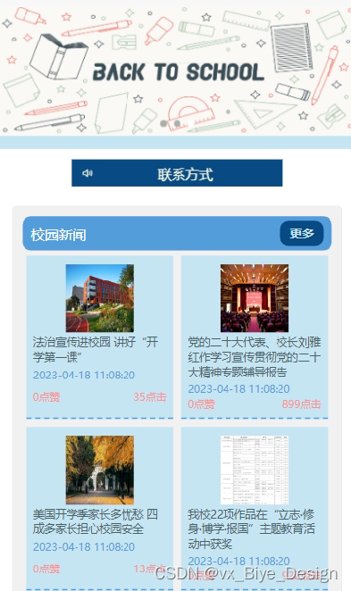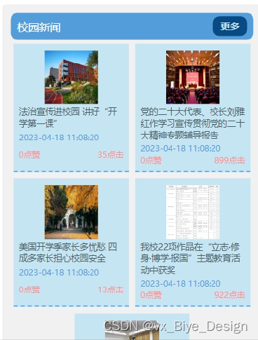 (5)校园新闻:当用户点击“校园新闻”这一菜单按钮,会显示管理员在后台发布的所有的校园新闻信息,可以查看详情,进行收藏、点赞、评论等;