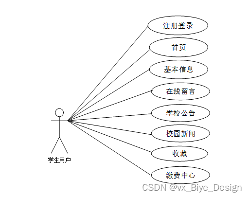 通过2.3功能的分析,得出了本Springboot中小学生收费管理系统小程序的用例图: