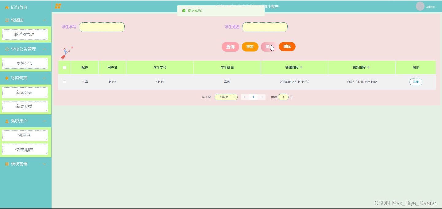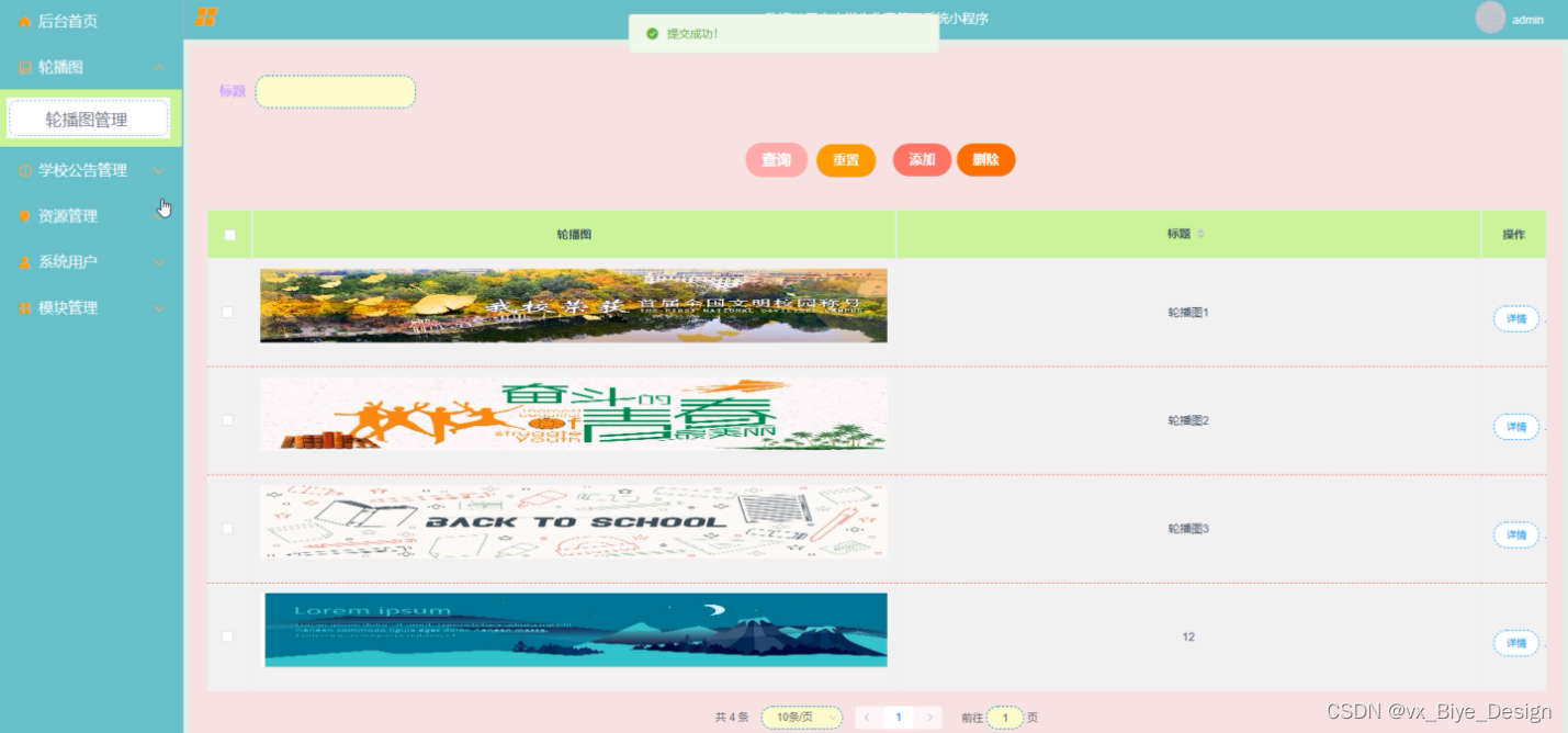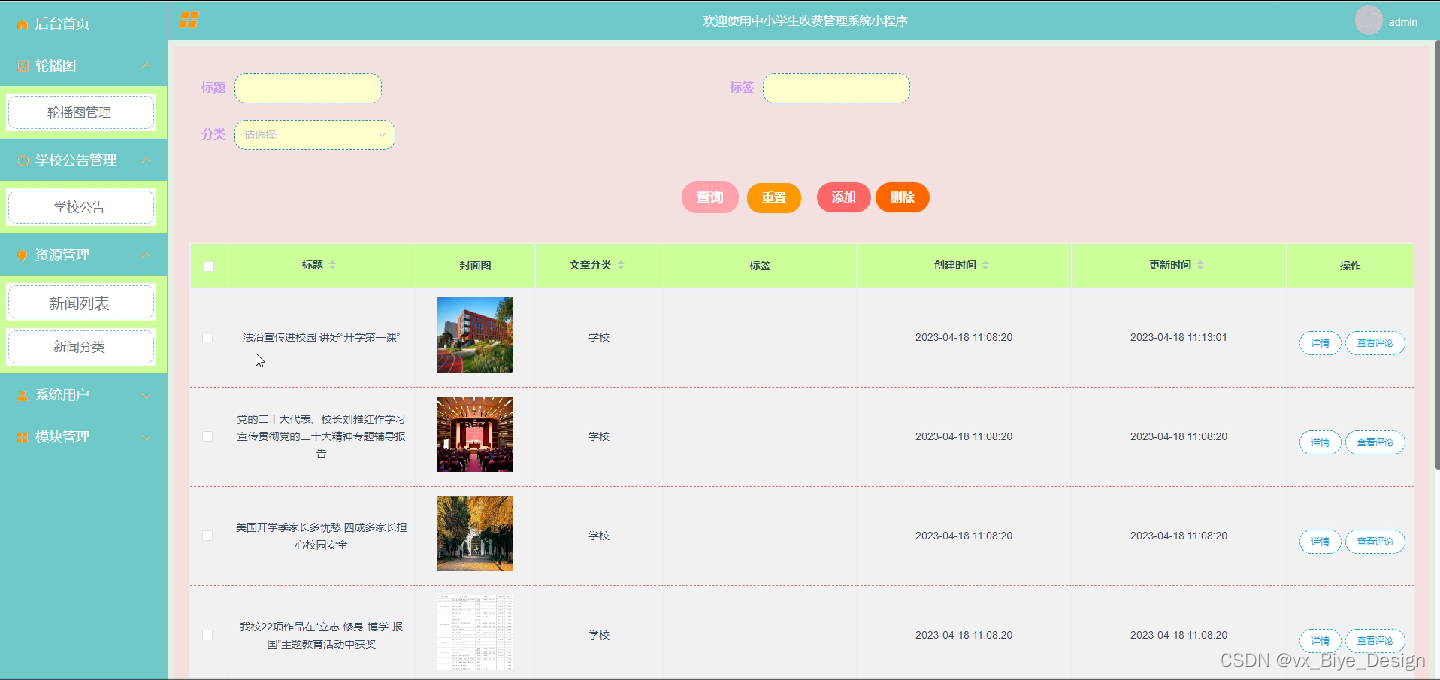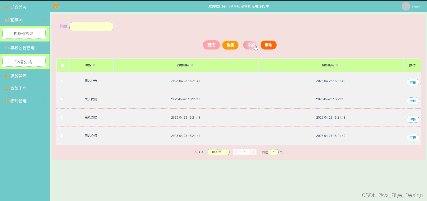 (1)轮播图管理:管理员可以对Springboot中小学生收费管理系统小程序中首页显示的系统中的一些轮播图发布到系统当中,让用户及时的查看到系统信息,进行合理安排。