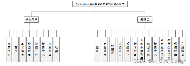 Springboot中小学生收费管理系统小程序是中需要存储不少缴费信息,其模块功能结构,具体的结构图如下: