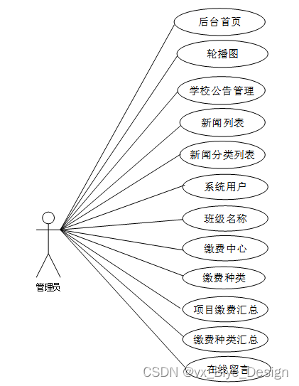 web后台管理上的管理员是维护整个Springboot中小学生收费管理系统小程序中所有数据信息的。管理员角色用例如图2-4所示。