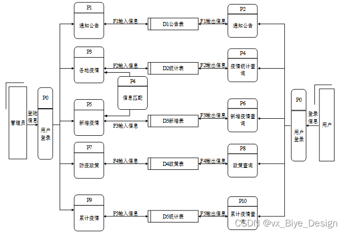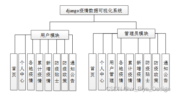 疫情数据可视化系统总体分为用户模块和后台管理员模块。