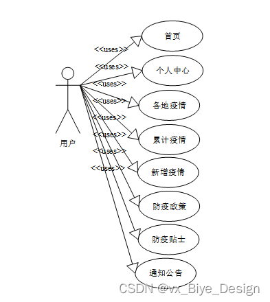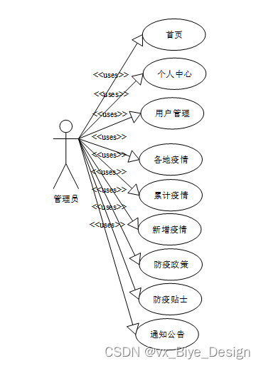 疫情数据可视化系统的功能主要分为用户根据自己的需求进行注册登录,浏览通知公告信息并对选中的通知公告进行浏览等操作。后台系统管理员因职责的不同,管理员主要对各地疫情、累计疫情、新增疫情、防疫贴士、防疫政策、通知公告进行处理。