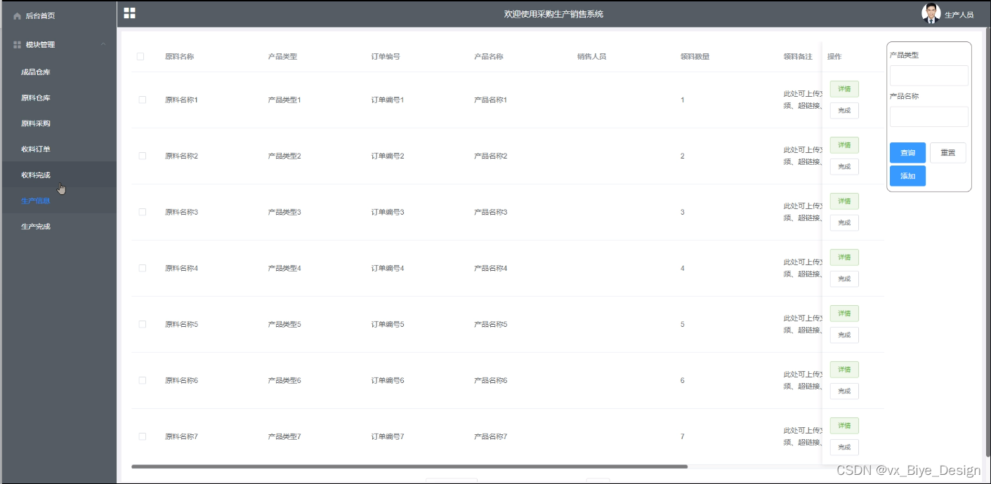 生产信息,在生产信息页面中可以填写原料名称、产品类型、订单编号、产品名称、销售人员、领料数量、领料备注等信息,并进行完成、添加、删除等操作,如图5-7所示。
